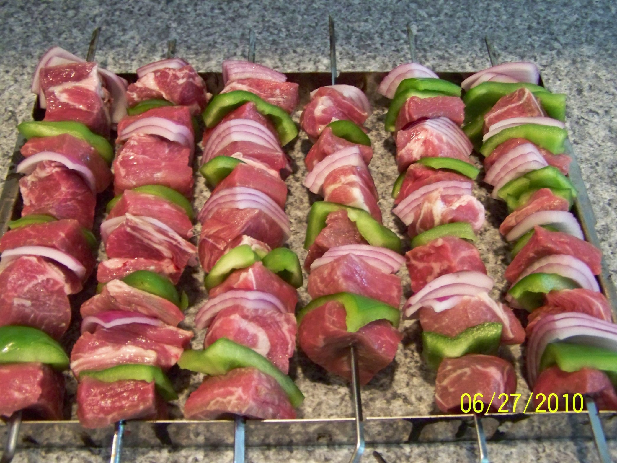 Steak, country style pork strips, red onion and bell pepper, all slathered in 1 of 2 sauces: Cattlemen's Authentic Smokehouse or Bulls Eye Carolina.