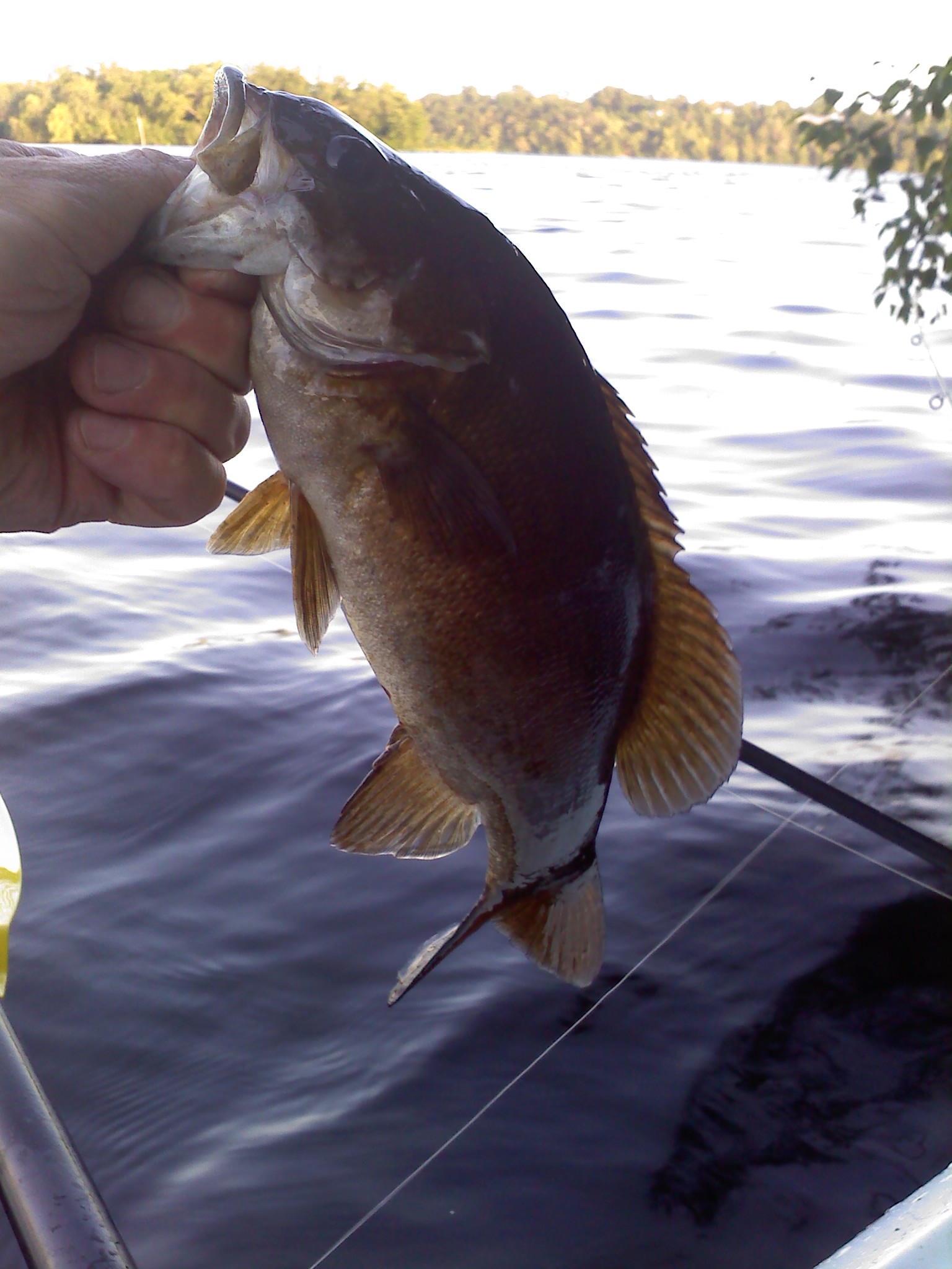 Took me all evening to find the bass. Tried all my favorite spots and nothing. Had no trouble landing the pike last night but then I came upon this shore with a rock "wall" in a part of the lake Ive never been and bam, the smallmouth action was on. The tailwalking action was good. Ive got the legal limit marked on my kayak and he was about 3" past that. The second fish and the others that followed were fairly small but loads of fun!!