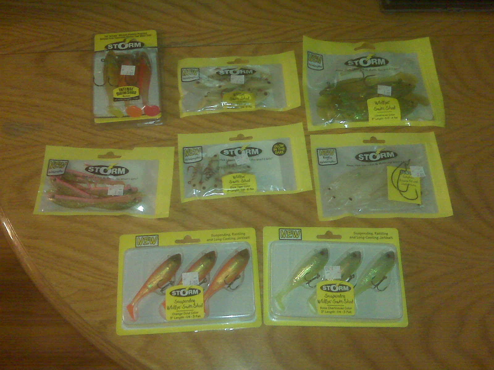 Browsing through K-mart yesterday, and found another little "goodie box" of marked down Storm soft plastic wild-eye swim & jerk baits. Price tag on these were marked down to $1.99, and with a 50% off coupon, I grabbed them up for a buck a piece.