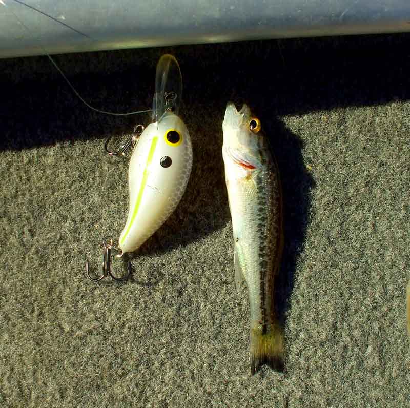 ...LOL...I do believe this is a personal record for me, as I've never caught a bass this small on a crankbait.....But I figured Bama musta had sumthin to do with it, so I thought I better share it with him.....So this ones fer you big John....I hope your laughing so hard you don't notice your throbbin toe. ....And just so's ya know....we caught quite a few "bigger" fish, and had a dang nice morning on the water, wisha coulda been here bud.Oh yeah, we also saw a grey fox swimming across the lake just after we hit the water....that was kinda neat too.