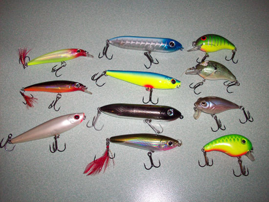 Used with some wear: Strike King 1XS Firetiger - has a little chip out of the bill, but still runs good. Bandit 100 - Bluegill - has a little paint missing on the eyes, but still runs good. River2Sea Wake Bait - Ghost Shad - A little paint missing New Baits: Bandit 100 - Taco salad Mann's Walkin' Dog - 1 in Chart./Blue, 1 in Shad Heddon Super Spook Jr. - Clear Shad, and Chrome/Black X-Rap Subwalk - Olive Green X-Rap 8 - Clown and Gold Ryan