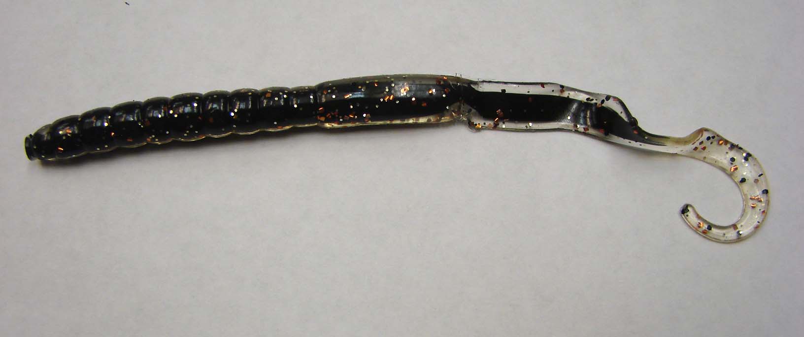 The worm is a 6" ringtail, the core is black (outer shell is clear) and has silver and bronze flakes.