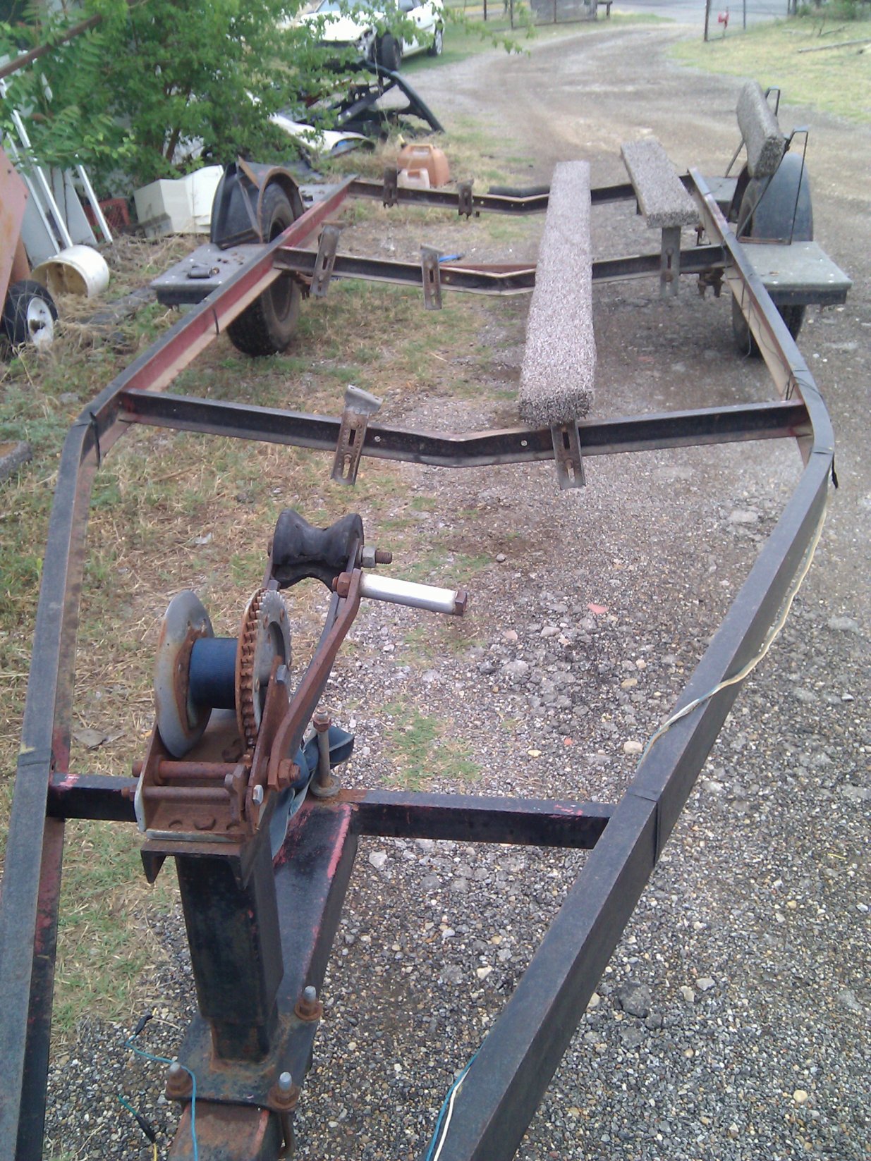 Been kickin' back and readin' through all these posts in this forum. Man o Man there is some good info in here. Last February my trailer broke at the tongue as I was loading the boat. No, I wasn't doing an 80mph approach. Tried to power load it and it was so rusted out, it just snapped. Finally got my used trailer from mechanic and it needed a little work. I didn't know where to start, so I'm ripping it apart and wire brushing all the rust off it to begin with. Bunks are toast, so they're getting replaced as well. Fenders are rusted through with cracks...going to cut them out too. Luckily dad owns a body and frame shop and he is nice enough to let me use tools, time and a place to work. Burnt up his drill today with that little wire brush though. So then, off to Harbor Freight. Got all the brackets off today, wire brushed them and primered those. Took everything wood off and surveyed the damage. Going to replace the side steps with HDPE. Got that ordered. Confused on what to do about the bunks, but I'll cross that bridge later. Right now, let's get it stripped, primered and painted. I'll post pics as it comes along. Here's what I started with. Do have one question though. Once I get the trailer finished and ready to set the bunks in their permanent position, just how do I transfer the boat from one trailer to another? The guy that owns the pallet shop behind dads, said he'd bring over a couple of fork lifts and get it done. All for the low low cost of a case of beer. Think I might have to check into that!