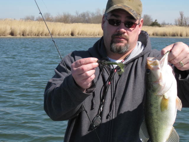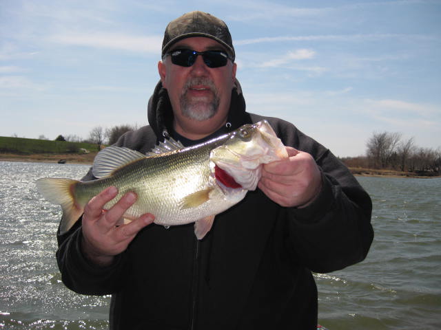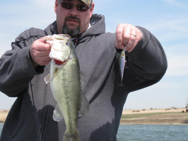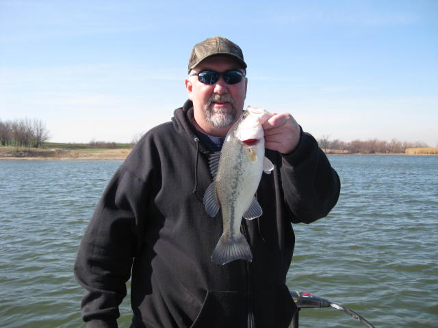 Well, actually it was more than a few. We lost count at around 50 bass. We went to a privat 20 acre watershed that belongs to a friend of mine. We were planning on trying to catch some Crappie. We were headed across the lake shortly after launching and I saw a lot of arches on the sonar. I droped anchor and was rigging a crappie pole when Tony made a cast with a swim jig. 1st cast and he caught a 3 lb bass. Tony caught 3 more before I even got my crappie pole tied up. I tried for crappie for awile, but with no luck. I switched to a football jig and caught a 3 lber on my first cast. I caught a few more but Tony was leaving me in the dust, so I decided to try a shakey head rig. It was just a fun day of fishing so I wanted to try as many different things as I could. The shakey rig didn't pan out so I went to a swim jig also. I had a white one but Tony was using a bluegill coloerd bait. The white caught a few but not lake he was catching. I got a dork colored swim jig and caught a few. The action slowed down so we switched spots. I again tried a crappie jig and caught an 8 in crappie. We tried that for awile, but it seems it was one lone fish. We tried the swim jigs in that area, but no bass were taking them there. We headed back to a similar deep water spot and went back to catching several more bass. I tried a crank bait for awile, but no luck there. Tony picked up a small one on a trap. We had both mentioned earlier that jerk baits might work . I only have a few jerk baits, I don't use them often. Tony had some nice LC baits and some H20 baits. He rigged one up and caught 4 bass on 4 consecutive casts. I laid down the swim jig rod and grabbed my jerk bait tray. I had a deep diving Rapala bait and tried it, I caught a few on it, but it didn't seem to have the right action so Tony lent me an H20 bait and I caught sevral on that, I also missed several that were short striking or got off before they got to the boat. My elbow has been acting up lately and it got sore quick doing the jerk bait thing, so I went back to the swim jig, I caught a few more on that. I switched back to a crappie jig under a float and spent quite awile resting while watching the float. Never did catch another crappie. The water temp was 52 and I guess the crappie are scatered and inactive. Meanwhile , Tony caught literally dozens and dozens of small bass, 1 to 2 lbs each on the jerk bait. The wind was howling by early afternoon and gusting 30 to 40 mph. We got tired of fighting the wind so we put the boat on the trailer and headed to another small pond to fish from the bank. We kept 2 of the biggest bass and transplanted them to the smaller pond. We both caught one bass at the small pond before calling it a long day. Tony had the big fish of the day at 4lbs 6 ozs. here are a few pics to drool over.