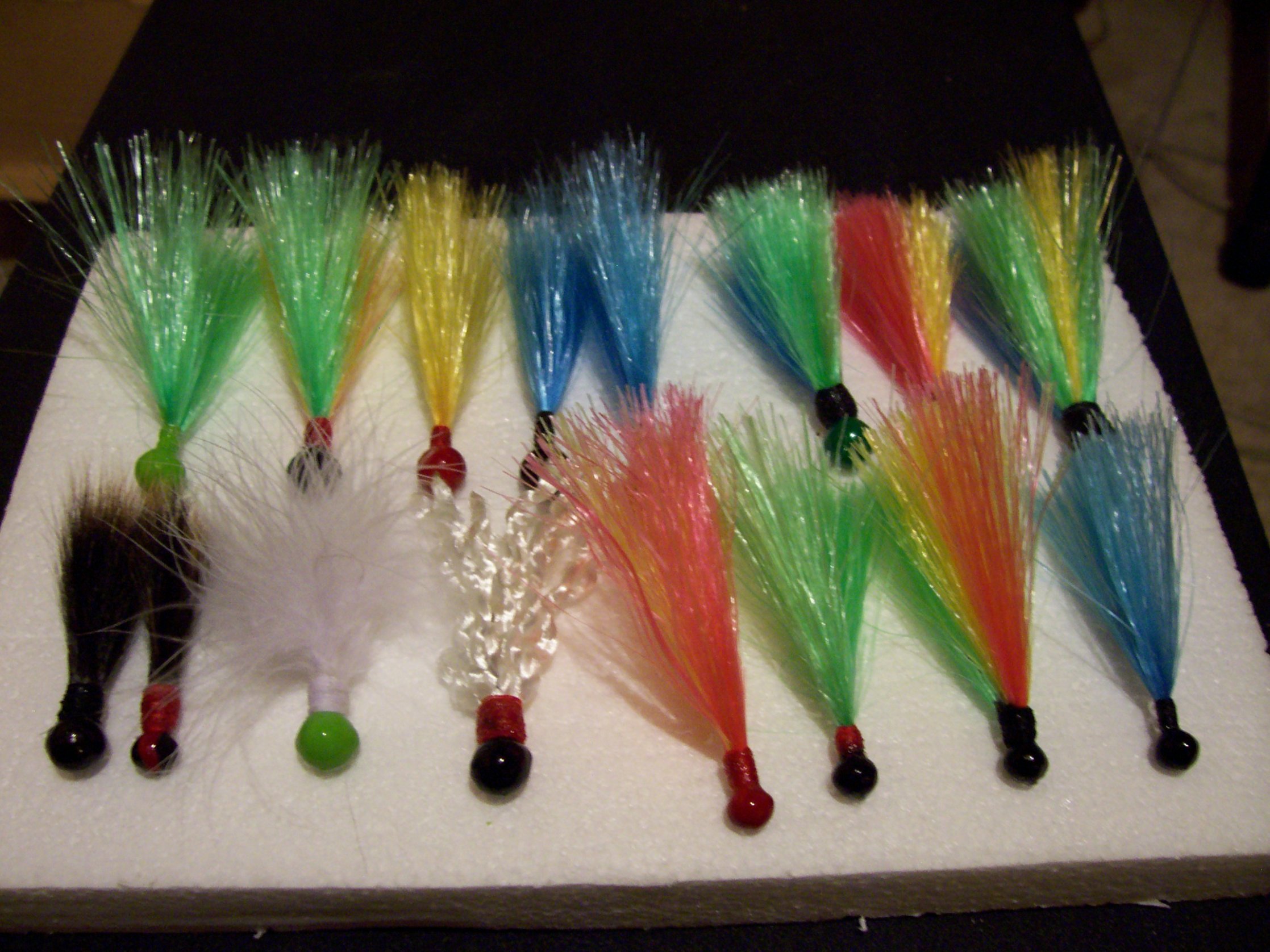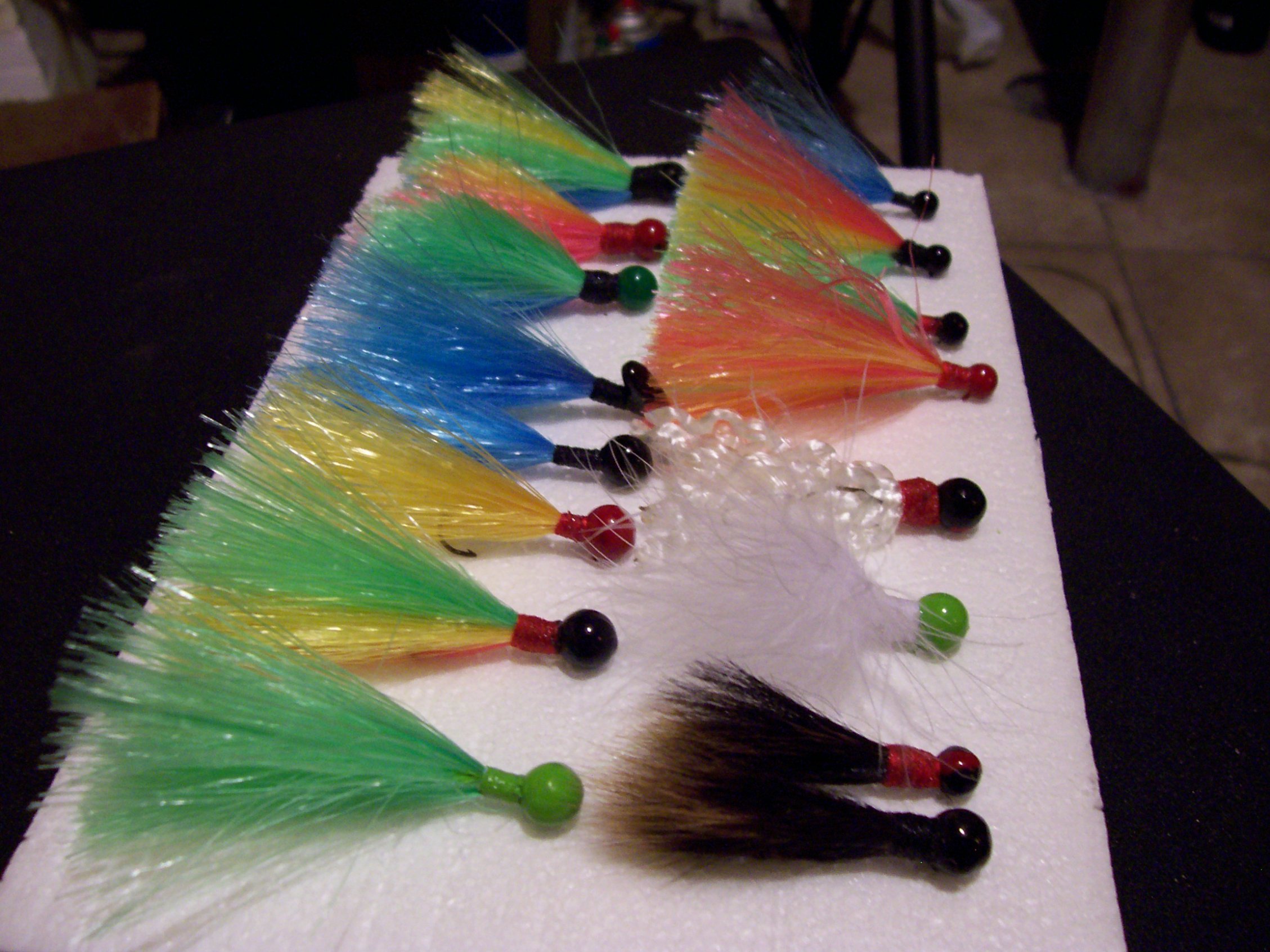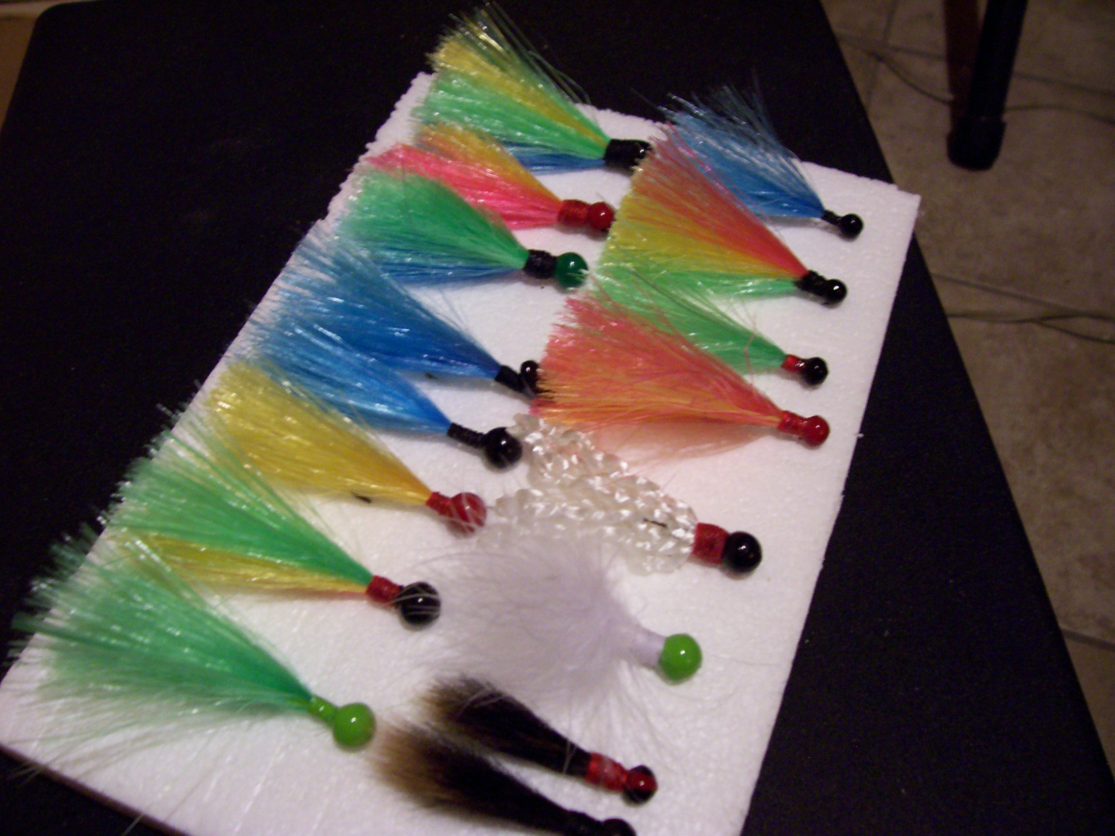 They're tied with a synthetic type of hair thats really buoyent i picked up at a craft store... I was thinking about calling them Hybrids cuz of the synthetics, just an idea... and i don't know i figured maybee i could get a buck or 2 for them... oh and the the other ones were just some i made with some squirrel tail and marabou feathers.