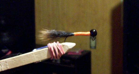 1/8th oz ball head jig, orange thread body, black squirrel tail... wanted one with a slim profile, what you guys think? I know it could be better...