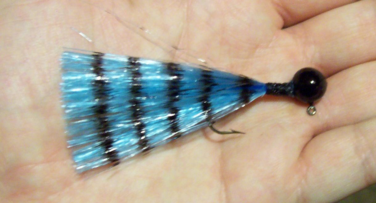 1/4 oz. ball head jig... blue skirt with striped patterns. Whatcha think?