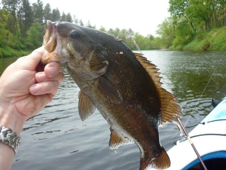 Well it was a great Memorial Day on the water. I only caught three fish but lost several "nice ones". This smallmouth had length and heft to it. I had a rubber worm wacky rigged that I had just tossed over the side to get out of the way so I could look around in my tackle box, and then bang, I thought I had a snag. I alos caught a smaller smallmouth and a true hammer handle pike.