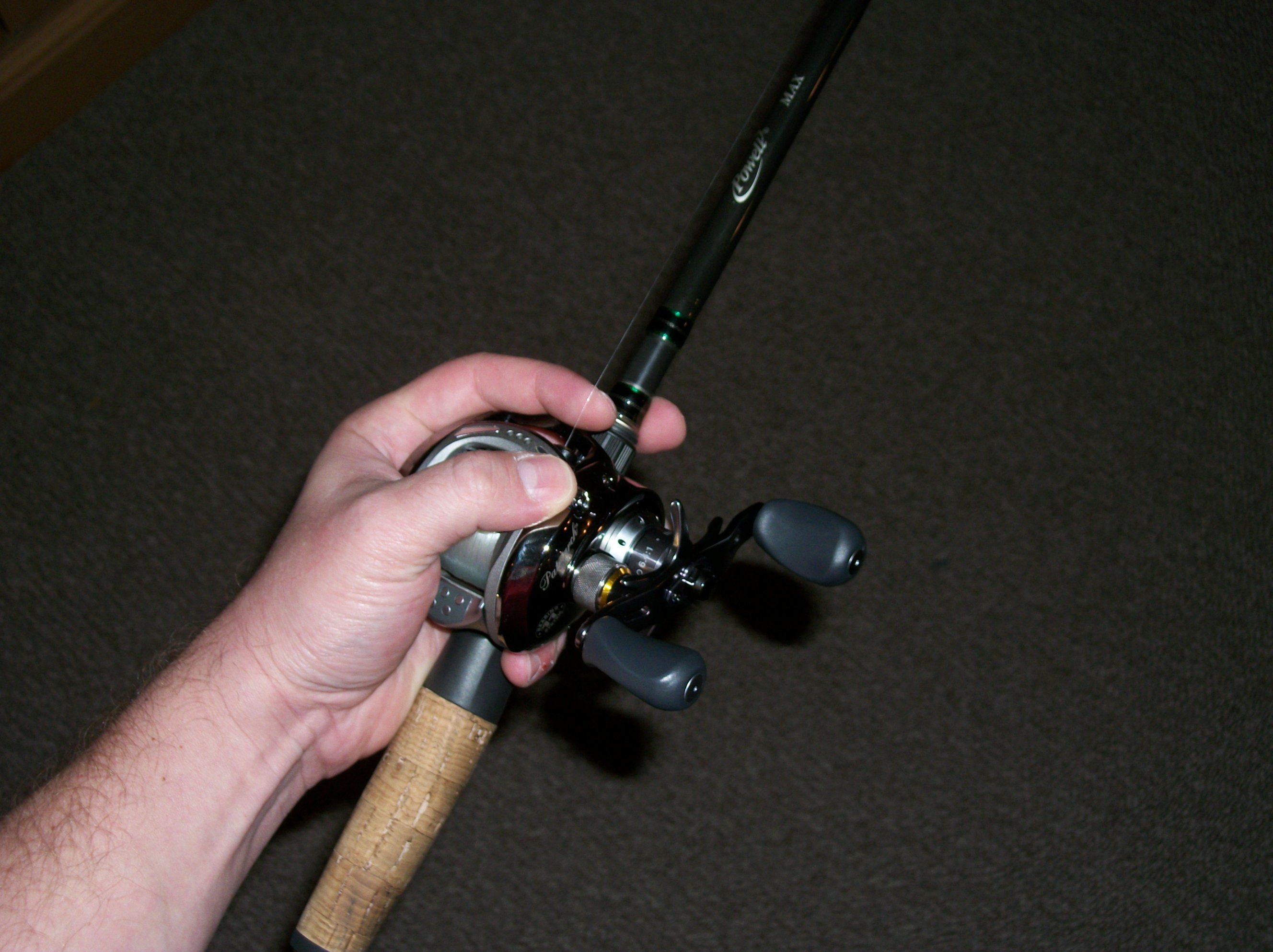 I palm baitcasters so that the line runs over my index finger with baitcasters and with spinning reels I keep my index finger on the line as much as possible too like this: