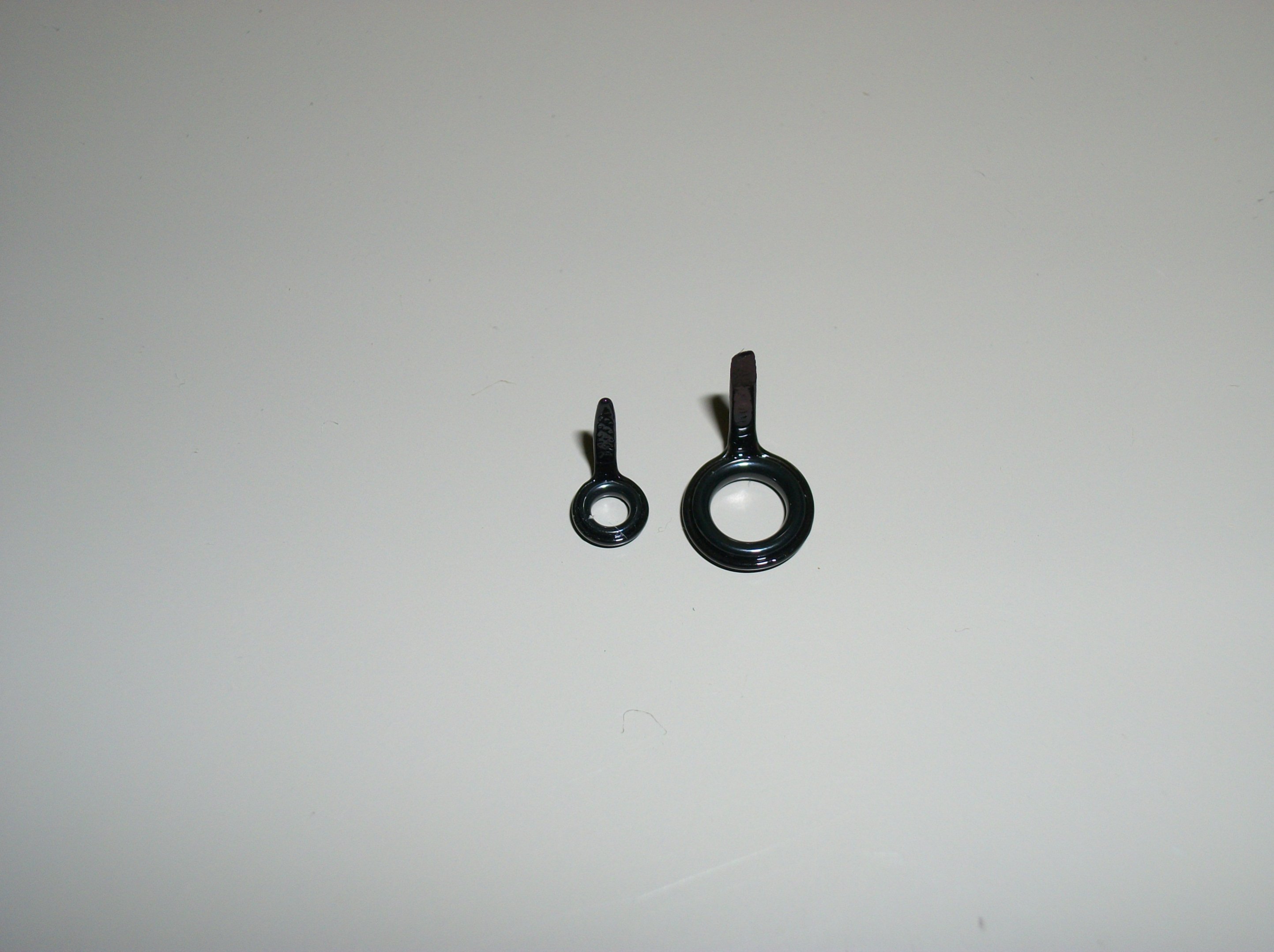 Here are a couple of pics of guides for comparison. The small one is a Fuji size 4 micro and the larger one is a Fuji size 6. The 6 is the smallest guide used on any production rod with conventional sized guides. These rods also usually go up to at least a size 8 double footed guide which is considerably bigger. When I build a rod with micros, I will use all size 4's. That creates a huge weight reduction out toward the tip of the rod where it matters most.