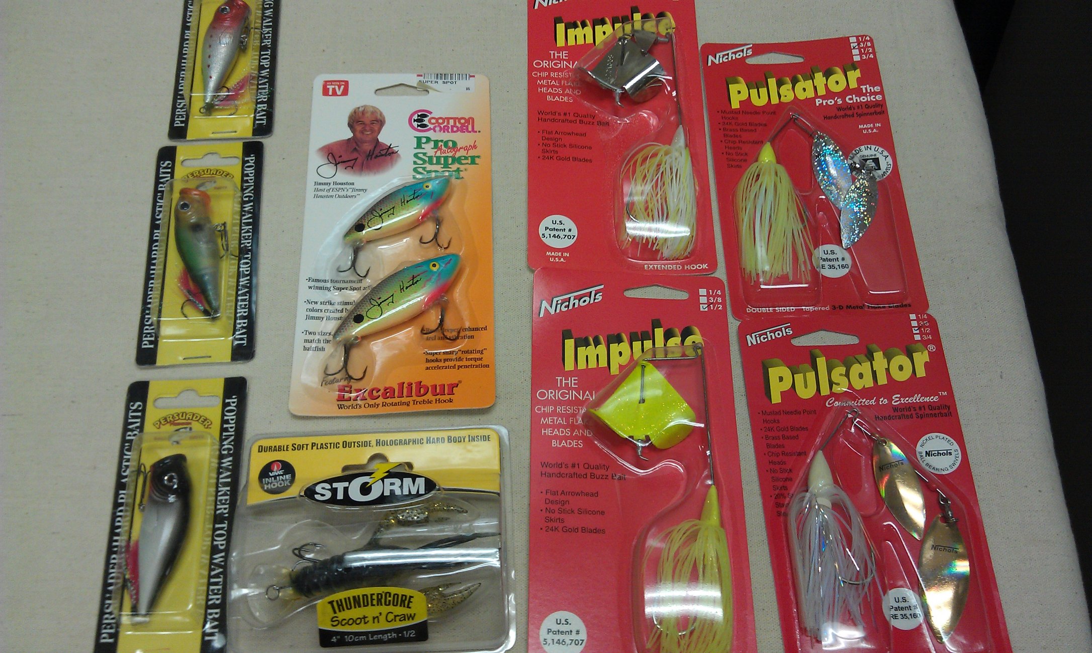 I have a "lot" that I would like to offer. I picked out some good baits that are due to catch some fish. All lures in original package. Keeping the lots relatively small so it's more affordable. I have a large number of lots that I will be posting. Too many samples that I need to sell off and make someone happy. Nichols Blades, Persuader Top Water, Storm Scoot and Craw Crankbait, Jimmy Houston Lipless Crankbaits.