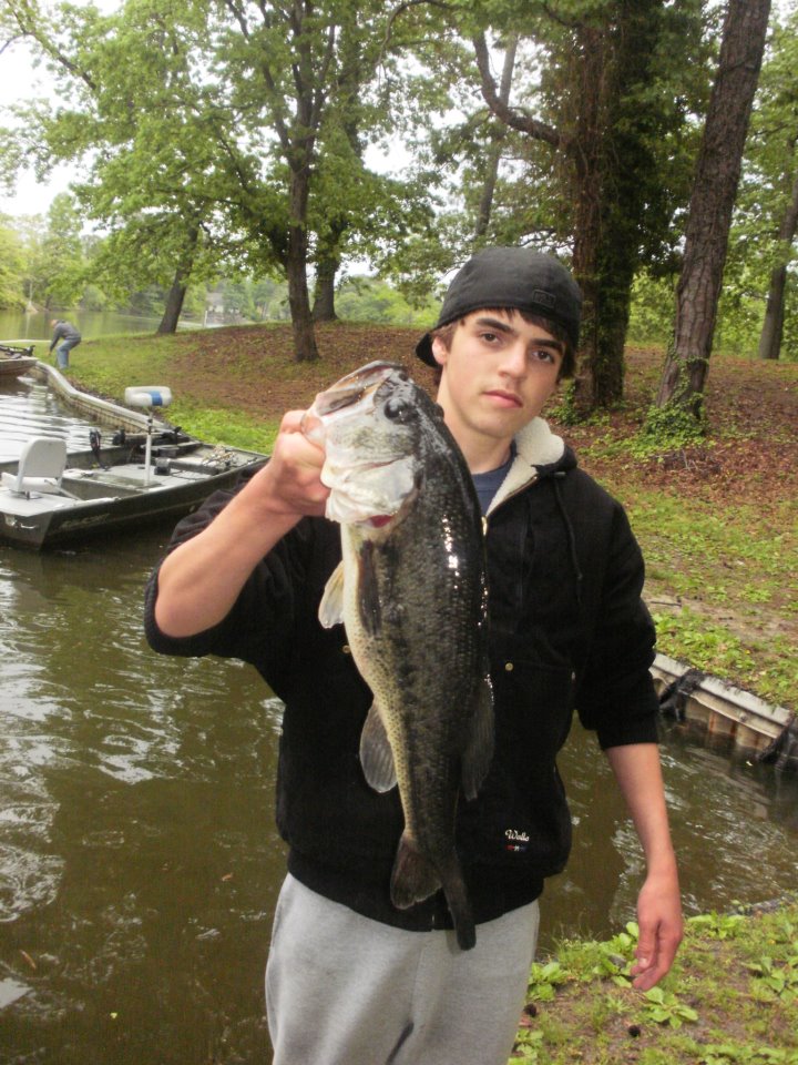 I was fishing a tournament with my friend stevie and I ended up pulling this little guy out of the water....Along with it we managed to catch 8 more. However only 4 of the bass were big enough to weigh in. We thought we had won once we caught this one, because this was a small tournament with only about 13 boats, little did we know, we would come in 6th place with 10 lbs, the person who won had about 17lbs....His biggest catch of the day was 7lbs...Overall it was very fun, especially because it was our 1st time fishing the lake. The lures we used to catch the bass on were the yum dingers wacky rigged weightless, and watermelon zoom flukes.
