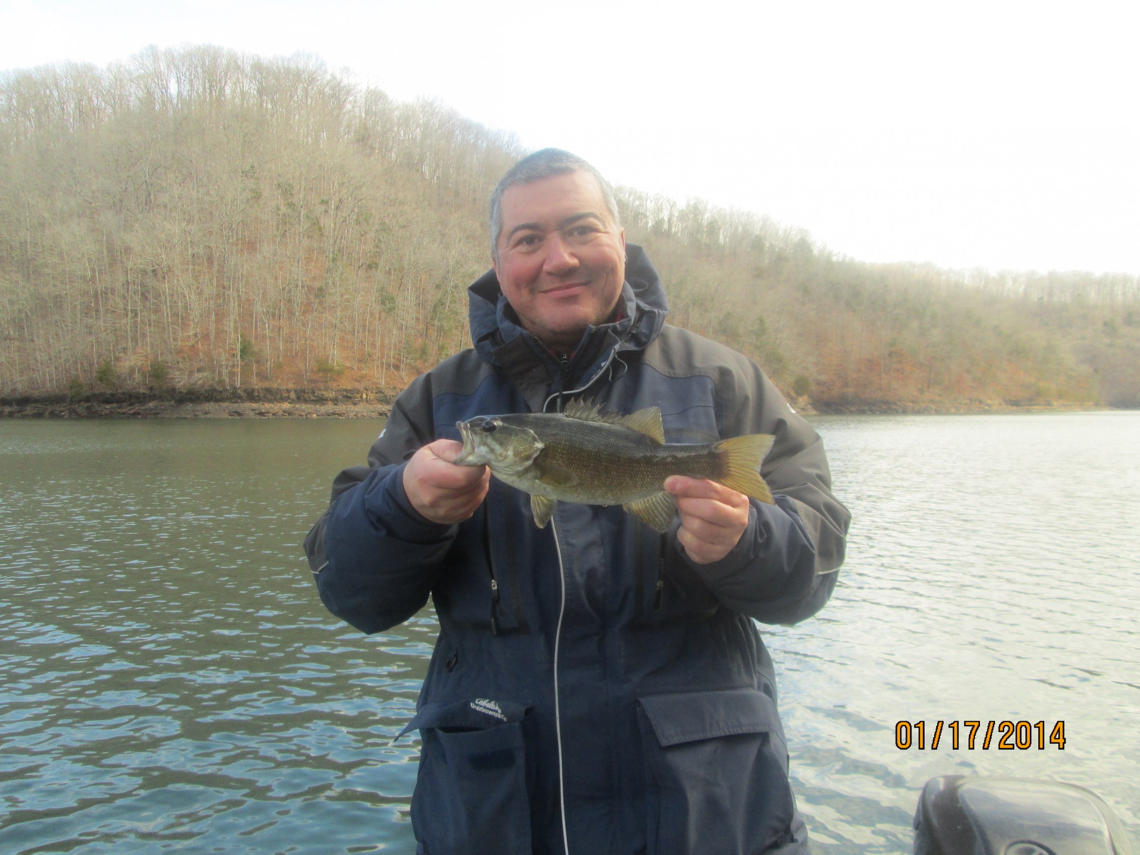 I met my buddy with his boat from Evansville Indiana at Cedar Hill's boat ramp this past Friday morning just before sunrise, with mostly cloudy skies, and a fast moving Alberta Clipper bearing down on us. It did seem as if the conditions were ideal for smalljaw fishing. We decided to head south to a no name creek next to the restricted cove belonging to the ACOE, to look for bait and found none. We then idled along the bluff wall heading toward the restricted area and the dam, looking for bait and finding none. We also looked for bait around the mouth of Dale Hollow Creek and Horse Creek with no baitballs to be found. So then my buddy had a couple of spots over in Indian Creek that he wanted to check out. At first we didn't notice any baitfish in the area, but we decided to go ahead and fish a secondary point that had produced fish for him in the past. After spending close to 30 minutes there with nothing to show for it, we decided to make a move, and what a move my buddy decide to make, all the way to Long Branch we went, through one heck of a snow squall blowing out of the south sideways right into our faces. I'm glad I made the investment of buying a full face motorcycle helmet; it was money well spent. After searching Long Branch with no sign of bait, we decided to head over to Lick Run, all the while checking main lake structure for bait and finding none. After putting in about 4 hours searching for bait we finally were able to find multiple baitballs at about a depth 9' to 10', in a secondary creek, with mostly cloudy skies. We caught two within 40 yards of each other back in the pockets, one brownfish being a 14" under and another 16" slot. Conditions: Water temp. 45, mostly cloudy skies, steady 15mph wind out of the SW with 20+ mph gusts, 9' leader with duck feather Chart. and purple fly. The next day conditions, before mid=afternoon,: mostly sunny skies, 8 - 10mph winds out of the SW. We located bait back in Indian Creek near a secondary point, and managed to catch 3: 2 brownfish @ 17" and 1 healthy spotted bass 18", off the some productive secondary point. I was using a 13' leader under a bobber with the same colored fly. Considering that this was only our second FNF trip, I considered it to be a success, but ONLY after putting in the TIME searching for baitfish. |