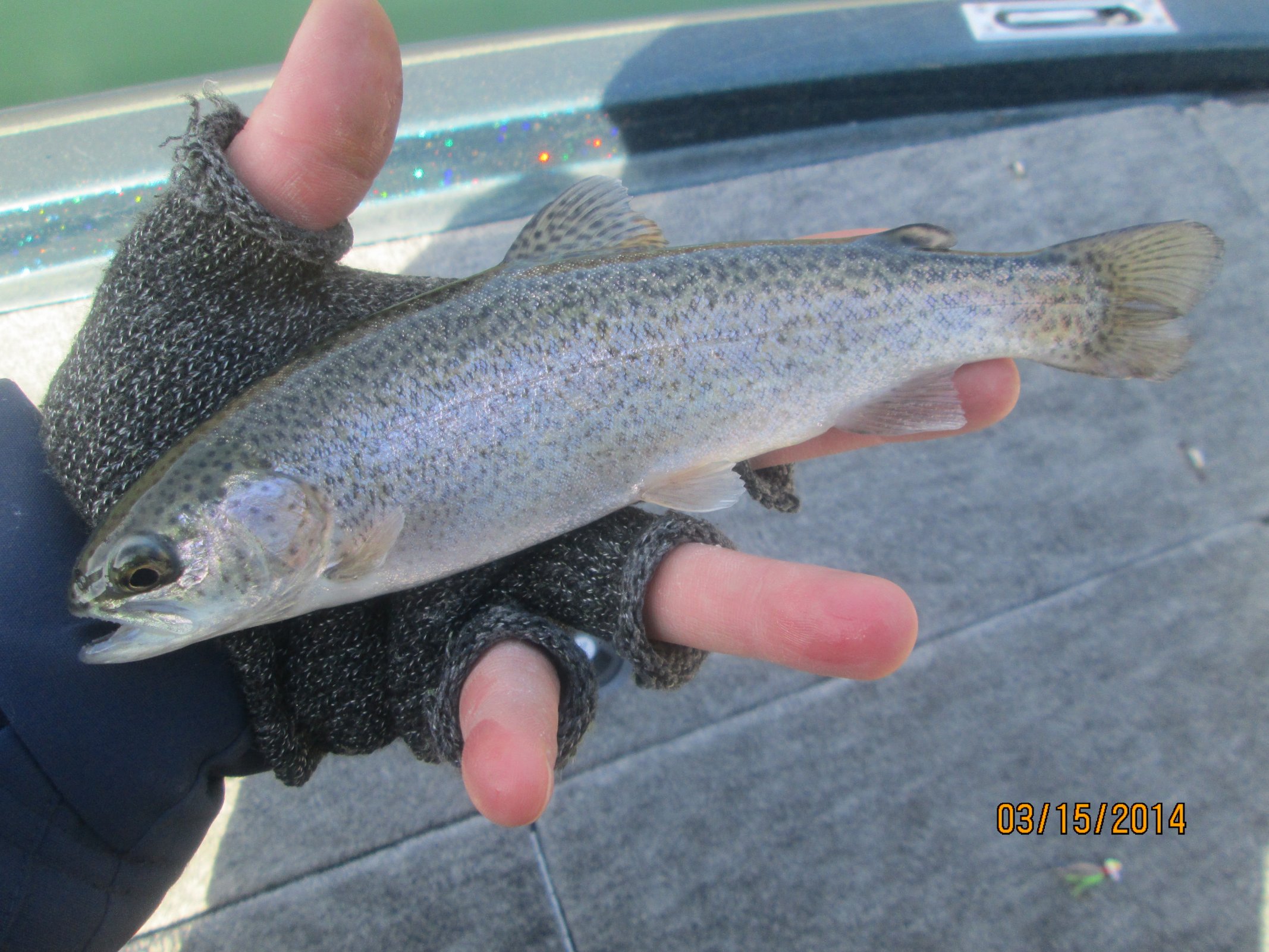 I caught them back in the creeks on the lower end. Indian Creek, Kyle Branch, Horse Creek, and the No Name Creek over by USACOE. Let me tell a guy could limit out really fast fishing a float n fly on these Rainbows. These trout were ranging in size from 8" - 12". TN regs. say limit 7 day with no size limits. -Mark |