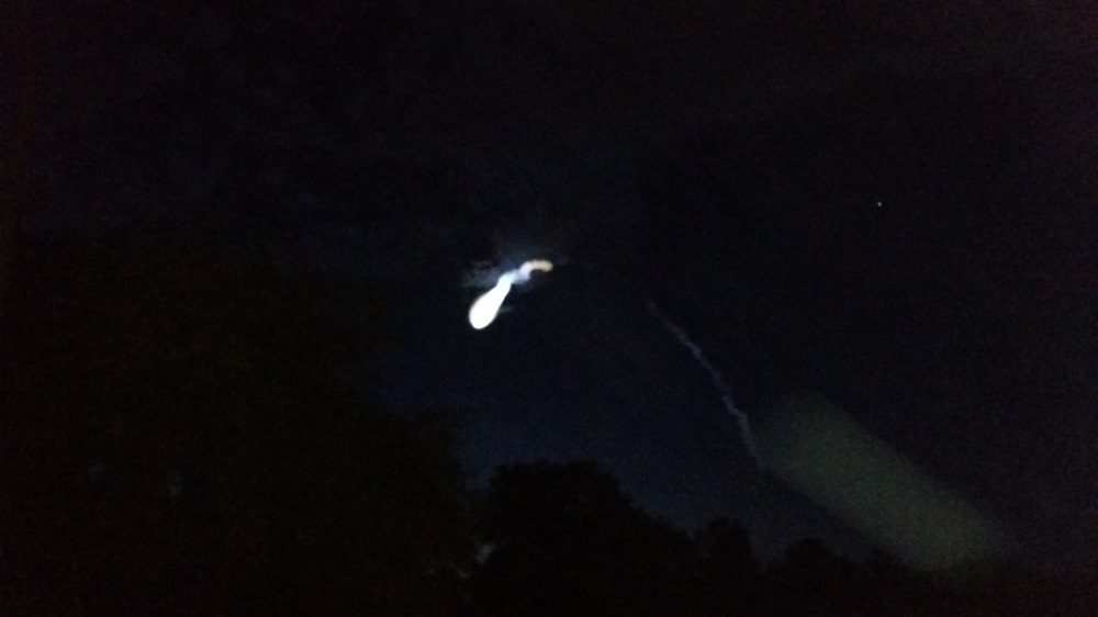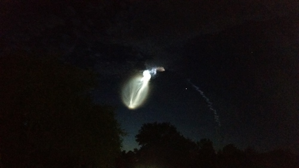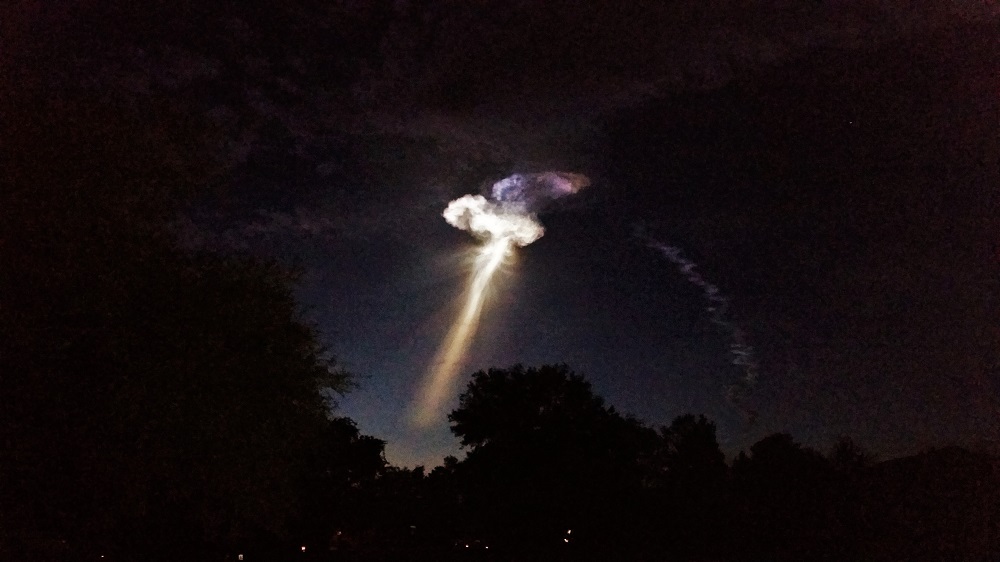 The track went into the sun's light and lit up the exhaust. When the solid rockets ejected and the first liquid stage fired up, the exhaust spread out. When the second stage took over, the final gasp of stage one was a neat ring spreading out from the center. The final image is the exhaust refracting "rainbows". |