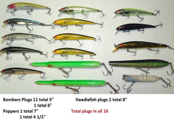 11 plugs 5” long 1 plug 6” long Poppers 1 plug 7” long 1 plug 4 ½” long Needle fish plugs 2 plugs 8” long Total 16 plugs in all. Asking $30.00 free ship. Your can PM me or my email is bass4everjim@yahoo.com |