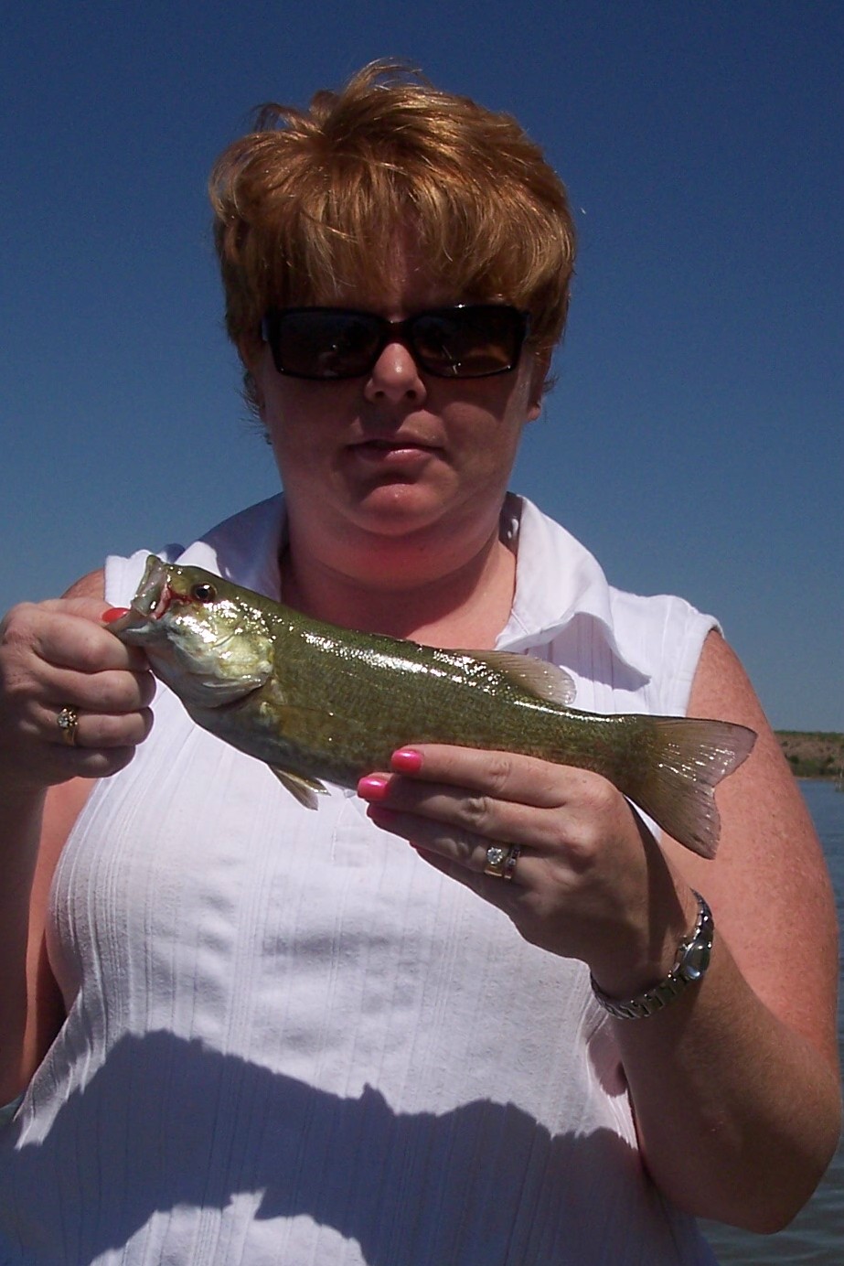 finally downloaded picture of my fishing buddy with her small mouth that she caught during our tourney at Ute Lake on 6/17/06..