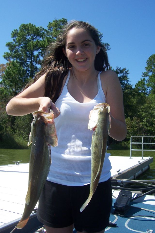 Here are a couple my girl caught last week. Not as big as the one your boy got. All together we caught about 20... not a bad day on the lake.