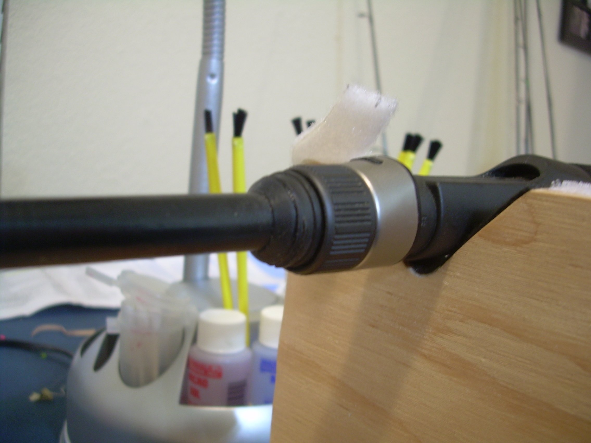 Great idea on the epoxy bottles!! I have ruined two bottles by wiping the syringes on the same paper towel and then contaminating the resin with the hardner residue from the syringes, or vice versa, if that makes any sense. The next time I buy epoxy I will definitely try that. I read on a rod building forum that after 24 hours it was a good idea to lightly sand when putting on additional coats. I slice off fuzzies and any trash that might have ended up in the finish and then lightly scuff with a 320 grit finger nail file. I don't really know if its necessary but i figure it can't hurt. Another thing I have found to work much better for me is to not use brushes. I use swabs. I work in the printing industry and we use these foamy swabs to clean various parts on print heads. They are lint free and much easier (for me) to control. Basically like a flat Q-tip but not cotton. We order from a printing supply company, not sure who else would sale such a thing though.