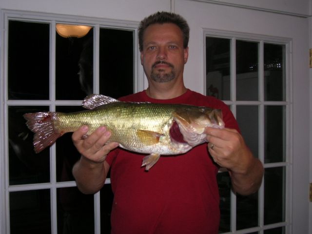 Had an hour and a half to kill last night so I went to a local pond. Water was stained but not real bad. A front had moved through earlier and cooled it down to mid 80's. They would not look at dark colors even though it was overcast. Started catching small 10 inch & below bass on a bright robo worm. I then put on a bright orange one and below was the result. I transplanted him to a new pond behind my house after the pic.