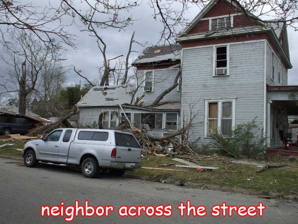 As for the experience, all I can say is "Wow"....I lived my whole life in the middle of tornado alley,Tulsa Oklahoma. but I had to move to Mena Arkansas to finally get slammed head on for the first time....hehehe...what a deal, but I hope its the last time too. We were eating dinner when the warning sirens sounded the first time, so I told the wife to take the grandbaby and get into the closet in our bedroom thats on the north side of our house while I fired up the police scanner to see what kinda cross talk I could pick up...our daughter was across town at work at the time....After hearing the cops talk for a few minutes I did what any typical male would do....since it sounded like it was headed my way I went outside to look around and see whats what of course...Duh....When I stepped out from under the back porch all I could see was a wall of black sky to my south, but as I stood there and listened I could hear a train....it took me several seconds to determine it wasn't a real train since tracks are close by and we hear them often....but something about this train was different....the louder it got the more it sounded less like a train and more like a blast furnace.....and huge blast furnace that was makin a heck of roar.....It was about this time that I decided this must be the real deal and I turned and headed the 15ft across the porch towards the back door, and before I got there the wind hit so bad I almost couldn't pull the stormdoor open...and thats sayin alot cause i'm not really a little guy....after a second big yank, I was in....slammed the main door behind me as I took off runnin thru the house yellin "its here, its here"....by the time I reached the closet and started to pull the door close behind me it hit.....windows exploded like a bomb went off next door and the roar was almost deafening.....but what amazed me the most was the powerfull instant vacuum within the room....the closet door doesn't have a latch or knob from the inside so I was just holding it by hand, and it was all I could do to keep it from being ripped from my fingers.....for a split second that scene from the movie "Twister" where the father is holding the cellar door closed and the tornado takes the door along with him up into the sky came to mind....but thankfully that wasn't the case here and in about 30 seconds it was all over. After checking on neighbors to make sure nobody was hurt we all just seemed to stand around in the middle of the street like zombies as we look at the sight before our eyes...It was a full moon nite and everything had an eerie orange glow to it till the moon got high enough in the sky that it began to look white again....I guess that was from dust in the air or something....I dunno but it was creepy....many things were not recongnizable and you strained to see what it was....Our poor daughter only works about 5 minutes from home.....they didn't get hit directly but she knew it was headed into our neighborhood so she's freakin out.....she spent the next hour and half tryin to get home and when could couldn't get by car she just left it and started walking....most of the time she didn't know where she was because everything looked different....even road signs were missing.....fortunately she made it home safely and found her baby and her parents safe and sound so all ended well....but boy what a stressfull nite.....Our oldest daughter lives in Tampa and just jumped in her truck and headed this way when she didn't hear from us......we finally got a text message to her, but she went ahead and drove on up to help with the clean up....and just to see our faces i'm sure. It wasn't until the sun came up the next morning that we all got our first look at the damages and we were shocked.....This area of town got hit hard....really hard, but we got off easy compared to most of the other folks.....We don't own this place, but we like it enough that we have rented this same house for 9yrs now and until now had no reason to consider moving because the area was just so beautiful....Its like an 80yr old house and in typical tornado fasion our house really wasn't hurt too bad while my neighbors homes lay in ruins....we lost shingles and got a few holes in the roof from where a huge old pecan tree was pushed over into it....it was growing just a few feet from the house so it just kinda leaned over onto the second story rooftop and stopped at about a 30 degree angle or so....I sure hated to loose that beautiful old tree,it provided shade for the whole house most of the day....naturally we lost most of the windows on the south and east side of the house, but in some cases the storm window broke but the house window did not....Ripped the roof from over the back porch and ripped the electric meter off the front of the house.....My airbrushing studio took a beating, but actually faired pretty good concidering its just a glorified shed with a tin roof...it only lost half the roof....ripped the back door in half and stuck several tree limbs thru the walls...the rest is water damage and just a messed up interior from blowing shingles/insulation and stuff......The worst part of it all for us was our carport/garage was destroyed...I mean like its just gone....both vehicles parked inside were still sitting there on the concrete slab...unmoved....naturally they got beat up somewhat by flyin lumber...busted front and rear glass on one truck but none on the other....Tore the front end off my newly acquired ridin lawn mower which kinda bums me out, but she'll still run.....Lost my tackle box and my BPS spincast combo that had been given me fits with line twist....both were under the carport....I tried to do a bit of searching but I quickly realized its like lookin for a needle in a haystack....theres so much debris piled everywhere its crazy....I suppose in exchange, I did find a nice lifejacket in my yard and my neighbor even had someones canoe land in front yard.....not quite a far trade though....lol....th