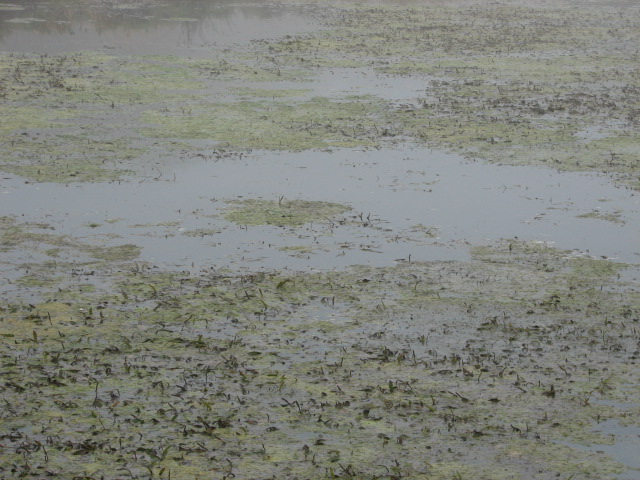 I started things off with a 3lb 4oz, 18.0" LM caught in the thick muck. It took some horsing to get him in. This was the first of three I would catch on an all black Spro Poppin' Frog. The second picture is what my frog looked like after releasing the fish. My dad landed the next one using a green scum frog. It was 3lb 3oz, 18.5". I finished things off with the last two -- both were 18.25", the first one weighed in at 3lb 9oz and the last one was the pig of the day at 3lb 14oz. Here's the junk we were fishing in. |