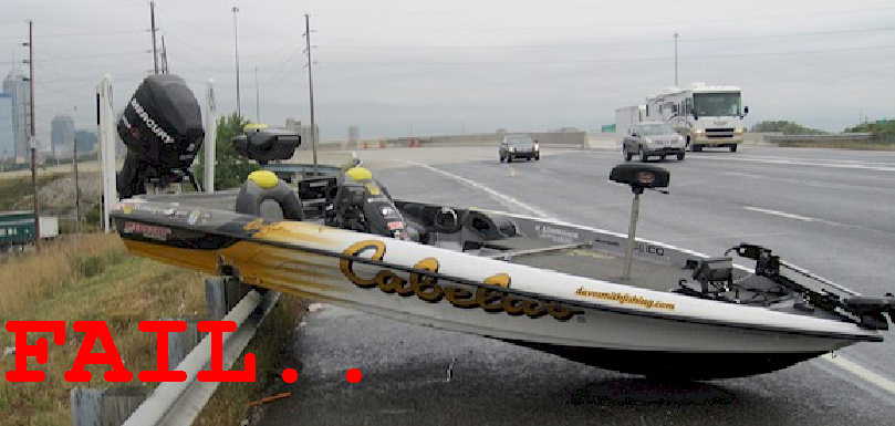 Interesting to that there's no remnant hook or strap in the bow eye. Probably got side tracked signing autographs. I've heard of reluctantly having to leave a boat on the side of the road....but jeez, I always thought you left it on the trailer! Bass boat fer sale - motor excellent, needs prop and hull needs a little work. Betcha somebody wishes their name wasn't on there! (Edit: Just hit me - it musta taken a heck of a bounce or two to get up on the guard rail like that!)