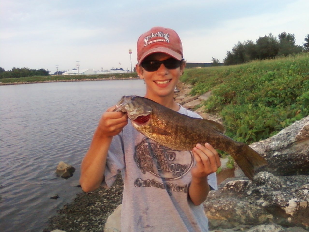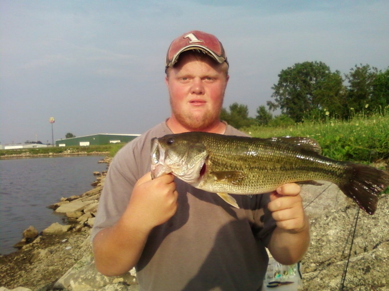 Ryan and I went to the local res today. It's the same one that I caught my PB largemouth out of on Friday. Wasnt that much action early except for a 3-12 largemouth that Ryan caught. Once it started gettin to 8:45-9:00 the fishing picked up. I threw a 5 inch Bass Pro Stik-O in Watermelon Candy right next to a large rock in the water. As soon as it hit the water my line was runnin. It ran about 2 feet and then stopped. I picked up and felt a head shake so I set the hook. Next thing I know that fish is 2-3 feet out of the water.