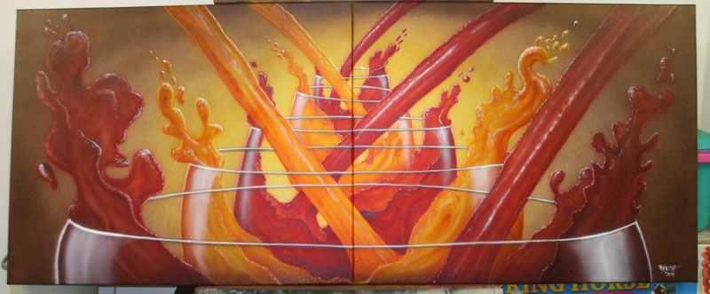 The total canvas size is 28 X 60 and its painted with automotive and acrylic paints....I forgot to take any closeup pics so you could see the details, but there's between 25-30 human faces camoflauged in the liquid....Its pretty funny cause at first you don't see them then suddenly you notice one, then another and then the search is on....lol My daughter and Son-n-law now have it framed and hanging in their dinning room, and are tickled to death with it....which makes me happy.