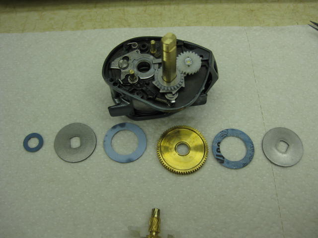 2 number 43 washers and 1 number 1 washer. The 43's are a perfect fit for the 2 main gear washers. the number 1 goes under the lower steel plate, it is a little big but you can match it with the original and then trim it with scissors and then sand it to smooth the bumps. I greased mine with cals drag grease for a smooth slip with light line. You are correct on the bearing sizes. I used Boca OS 7 hybrids, seals removed and lubed with a tiny drop of rocket fuel tournament to protect from corrosion. I polished the heck out of the spool shaft ends, then I treated the ends and the spacers with tungsten disulfied powder in a paste form. Added a tiny drop of rocket yellow to the spacers. Of course I cleaned everything and went with super lube teflon grease on the gears, rocket yellow on the clutch, and rocket red on the worm gear. I spooled it up this evening. I found a tip on jap tackle site for finnese reels. It said to use braid as a bottom filler because braid is lighter than mono or FC. I used 5 yds of mono to grip the spool, then I used 30 to 40 yds of 30 lb braid, then I tied my 8lb mono to that and there was still room to use most of the 110 yd mono spool. I need a good finesse rod for this reel, the lightest rod I have is to stiff. I found a zebco rod of my kids that was fairly limber, I found a floating walley jig that was nice and bright to use as a casting plug, I stuck a 2 inch grub on it and weighed it. It weighed 1/10 of an oz on my postal scale. I went to the yard and dialed it in. I was able to cast that little jig sidearm about 30 yds with no overurn. I was able to pitch it 15 yds with overrun, but if I put a little more power to it, the light jig went high and the reel backlashed at the end of the cast. I'm completly satisfied and doubt that any high dollar finesse reel works any better.