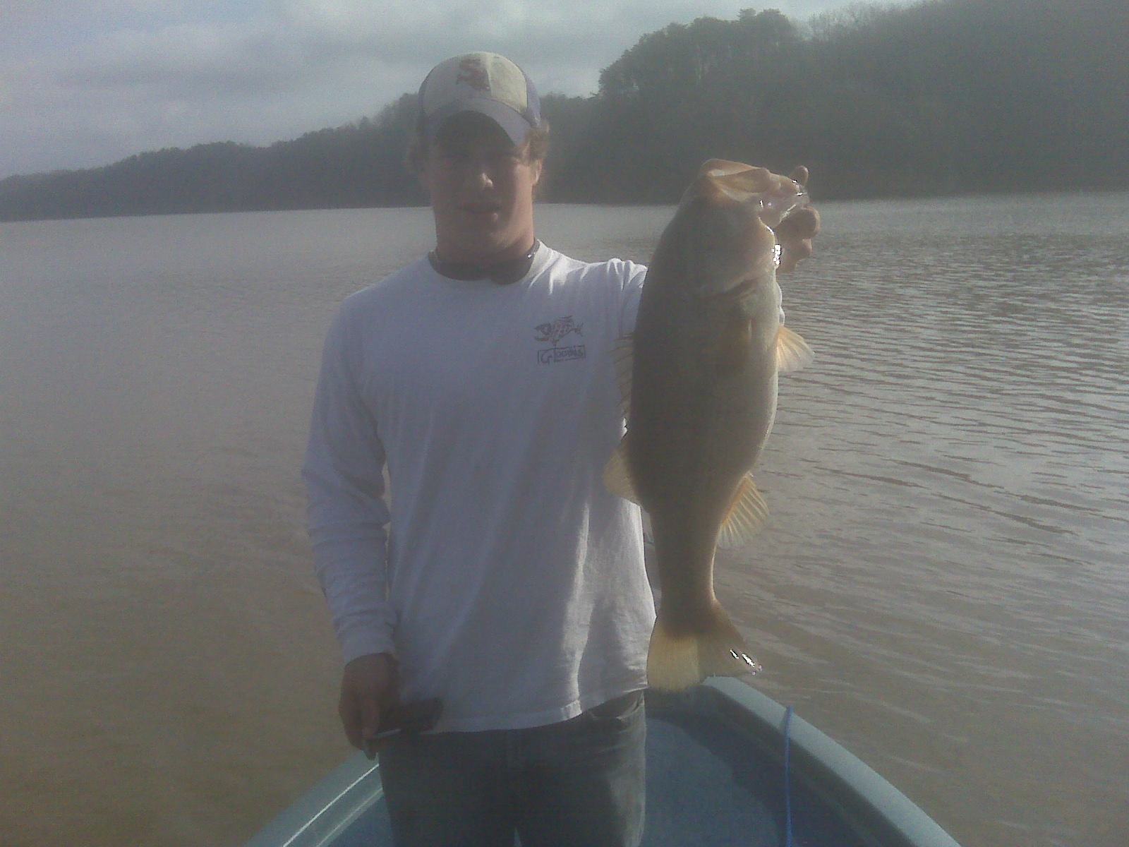 Got on the water at about 8 o clock this mornin and instead of crankin up and runnin the length of the lake like most anglers choose to do, we dropped the 'ol troller down and went at it. fished about 100 yards of the bank (black and blue sb with a worm trailor and double colorado blades) and came to some grass with a little structure on it. threw it to the back and rolled it about 10 yards away from the boat...STRIKE!!! right beside a log. forgot the net in the car so i horsed this 3.5 lb spot in and swung him into the boat, first fish of the day!