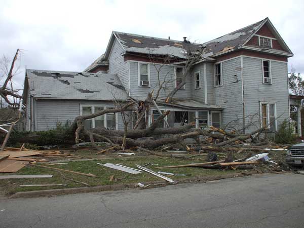 We were eating dinner when the warning sirens sounded the first time, so I told the wife to take the grandbaby and get into the closet in our bedroom thats on the north side of our house while I fired up the police scanner to see what kinda cross talk I could pick up...our daughter was across town at work at the time....After hearing the cops talk for a few minutes I did what any typical male would do....since it sounded like it was headed my way I went outside to look around and see whats what of course...Duh....When I stepped out from under the back porch all I could see was a wall of black sky to my south, but as I stood there and listened I could hear a train....it took me several seconds to determine it wasn't a real train since tracks are close by and we hear them often....but something about this train was different....the louder it got the more it sounded less like a train and more like a blast furnace.....and huge blast furnace that was makin a heck of roar.....It was about this time that I decided this must be the real deal and I turned and headed the 15ft across the porch towards the back door, and before I got there the wind hit so bad I almost couldn't pull the stormdoor open...and thats sayin alot cause i'm not really a little guy....after a second big yank, I was in....slammed the main door behind me as I took off runnin thru the house yellin "its here, its here"....by the time I reached the closet and started to pull the door close behind me it hit.....windows exploded like a bomb went off next door and the roar was almost deafening.....but what amazed me the most was the powerfull instant vacuum within the room....the closet door doesn't have a latch or knob from the inside so I was just holding it by hand, and it was all I could do to keep it from being ripped from my fingers.....for a split second that scene from the movie "Twister" where the father is holding the cellar door closed and the tornado takes the door along with him up into the sky came to mind....but thankfully that wasn't the case here and in about 30 seconds it was all over.