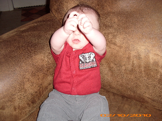 Bama sorry it took so long to get these pictures for you. It took a long time to talk Lake into wearing this outfit, he didn't seem to care that he was paying off one of his dads football bets and as you can tell in the pictures he is less than thrilled about it.