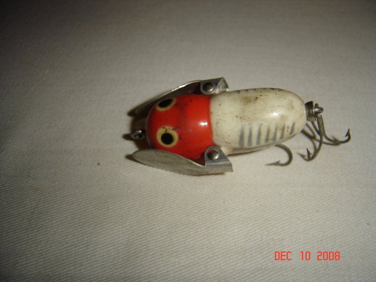 The red and white top water plug is a Crazy Crawler. It was popular in the 50"s and early 60"s. I would call it a predessor to the Buzz Bait. when cranked it rock sides to side and makes a sound like a jitterbug. I have one exactly like it that I have not fished in years and dont know that I have ever caught a fish on it. I think itb was made by Heddon.