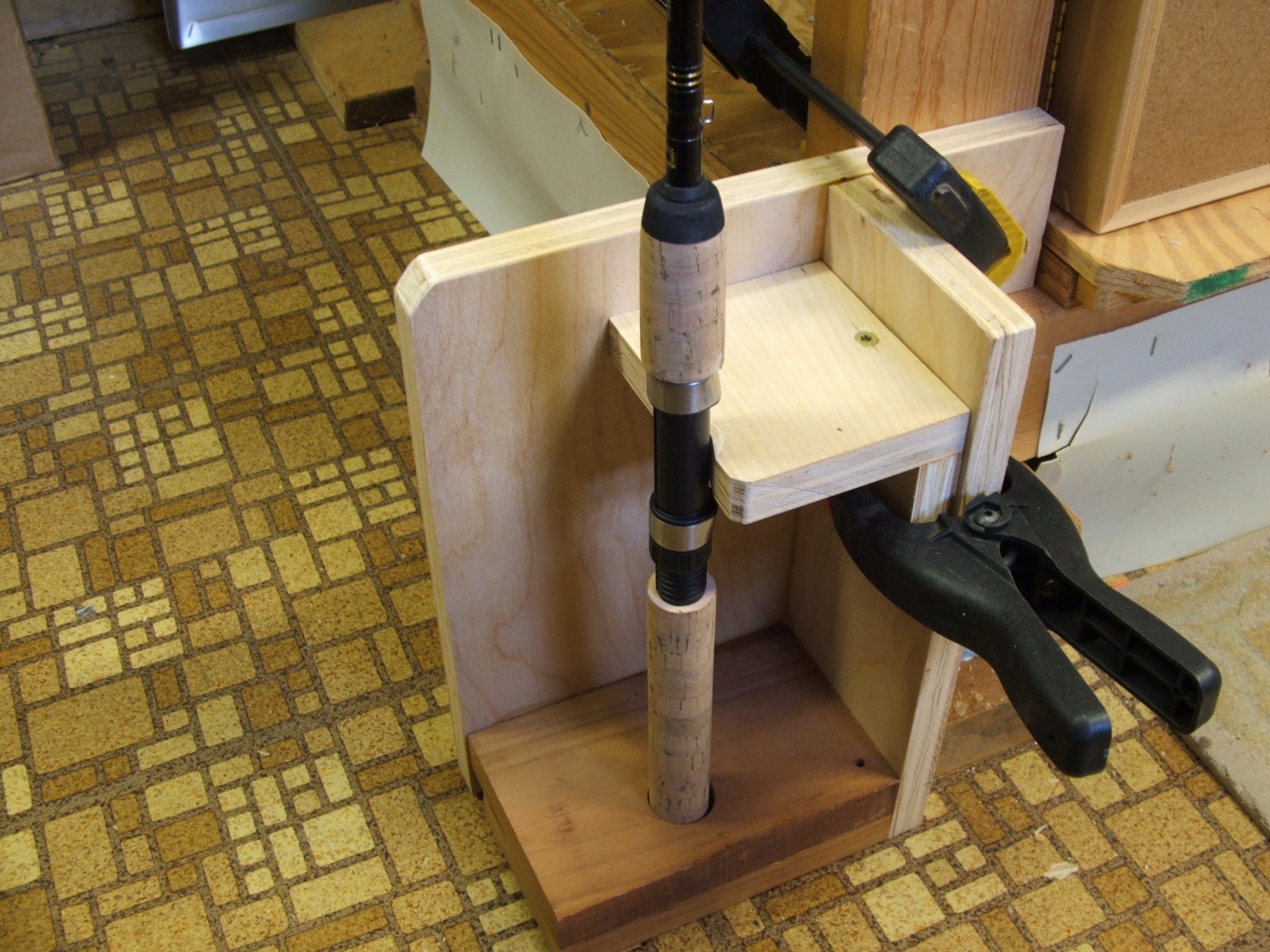In order to make a measurement on a particular rod, we will need some way to secure the handle end, so that we can pull the rod tip across an arc that approximates the range of flex that the rod may experience when a fish is hooked. We can decide on a suitable degree of bending by visual experimentation, but first let’s look at the rod holder.