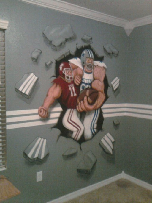 As you might remember, I came to Florida to visit my oldest daughter, and paint a wall mural for her husband a couple of weeks ago. It took awhile for me to come up with a design that incorporated what he wanted and yet allow me to have some artistic freedom and add my own flair, but in the end this is what I came up with. I know it ain't the typical football theme, but thats how I roll....lol