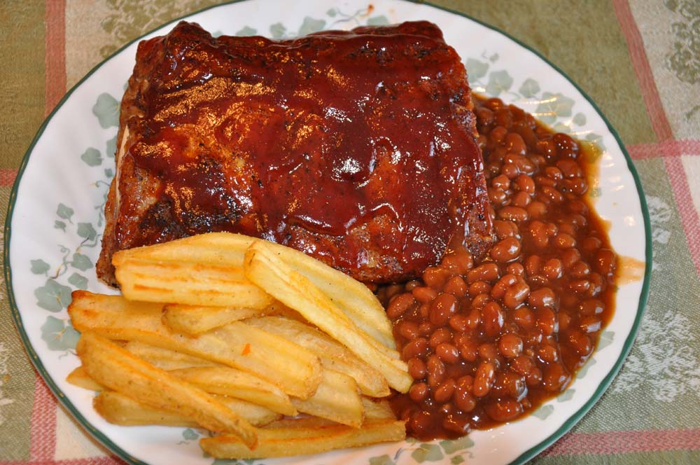 A couple months ago I posted a question suggesting how to cook a great rib dinner indoors using ONLY our oven. No grill was used in this experiment. And I can tell ya it was a huge success. Everyone was VERY happy with the results. My wife said she would never eat another restraunt cooked ribs dinner and enjoy them as much as she did mine today. I know, this sounds like I've got a big head. But I was so thrilled with how they turned out my first time cooking them this way. They were literally fall off the bone goodness! I applied my home made rub friday night, and let them get happy untill today when I popped them in the oven at 225 degrees for 4 hours. Then I took them out drained the grease, and applied the Sweet Baby Rays Hickory and Brown Sugar BBQ sauce and baked another 10 minutes. mmmm mmmmmmmm Gooood!