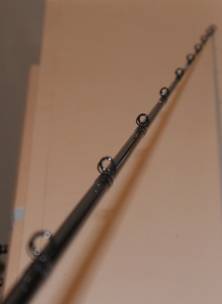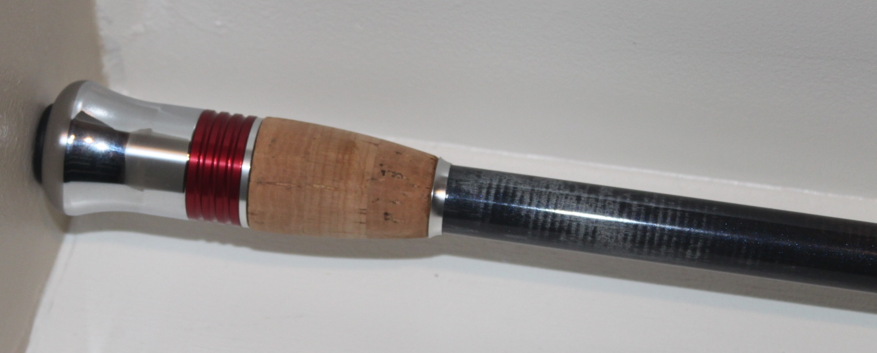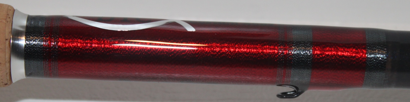 This is a Castaway BB965 8' blank, double exposed Castaway reel seat, AmTak guides, and a Forecast weight system (Which is why I call it Pimpin Flippin - It just hollers pimp cane). Not only is it a rod, it doubles as a night stick. I built the rod with a 13" handle and the tip balances between 1-2 o'clock for usual waiting position. The rod was built for a Quantum Accurist PT w/the flippin' switch. I used variegated blk/gry thread for the guides, and met gunmetal and red to highlight the reel and weight on the rod. But the guy told me he didn't want a lot of thread work on the blank, and I just used it for the stickers. The rod weighs in a 6.2 w/o the weight (5 oz). Pretty heavy, but the balance makes up for it to me, and hopefully the guy I made it for. Your criticisms and compliments are gratefully accepted.
