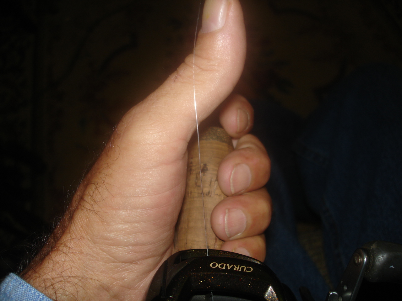 I palm baitcasters so that the line runs over my index finger with baitcasters and with spinning reels I keep my index finger on the line as much as possible too like this: