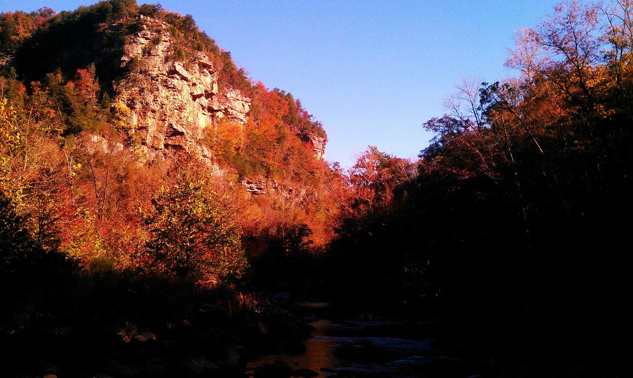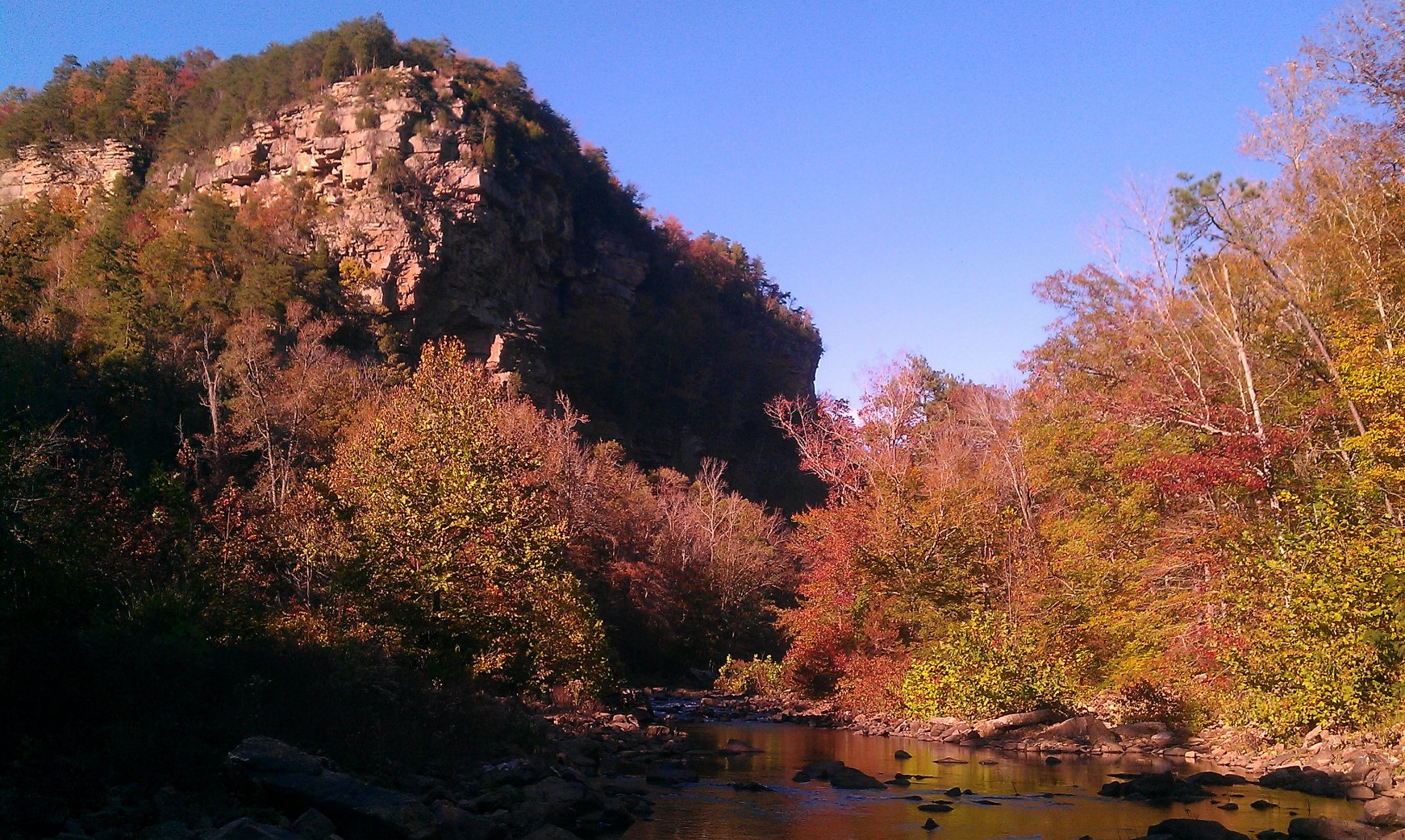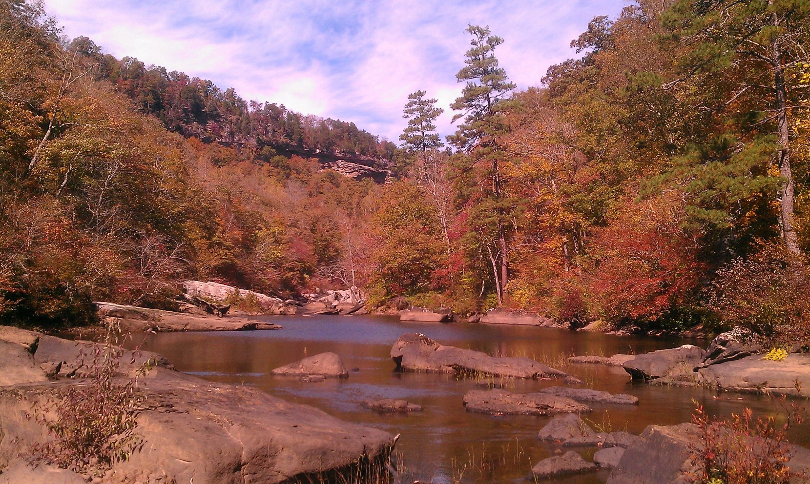 The pictures mostly speak for themselves, including the relatively few bass. A cold front had passed through 2 days prior, and the skies were still deep blue and the wind was a huge problem. The first location was lake Guntersville, out of the Langston boat ramp. The wind started up as I was putting in, rolling straight up the lake and turning it into a fury of rolling, white capping waves. I, with only my 10’ kayak, fished anyway. The trick was simple, I slogged over the mats of milfoil which kept the waves in check. As long as I stayed on the mat, there was nothing to worry about. I only manage 1 small dink, on a senko. Also ran into a school of bream that I fiddled around with a while. Threw spinnnerbaits, flukes, senkos and a frog. The frog still got lots of hits, but they must have been dinks…nothing big enough to get a hookset on. The 2nd place I fished was that evening, town creek in the actual creek. Same story, pretty, some very large and impressive stretches of rapids. Only a few bream on a hopper pattern with the fly rod. Did find 1 half of a torn up kayak paddle, which I will turn in to a single handed paddle. That night, I crashed in the truck. Got some nice sleep, the temp was nice and cool. The next morning I fished in the Little River Canyon, which is the deepest canyon in the US east of the Mississippi river. The fishing again was lousy, although right before leaving I found the fish would hit a white with crystal flash wooly bugger fly. But on the whole, I caught 2 redeye bass, and several good bream and that’s it. One of the redeyes is in the back, I am gonna let him live in the aquarium. Then, after hiking out, I drove to sheik seaver’s compound, which is strategically placed on the high ground. Got there a little late, but we saw the Bama-UT game, and I was fed a hell of a roast. The next morning, we attempted to fish that which is known as the dead sea, a large body of water, reputed to be sterile. There was no current, and the water was glassy, like a desert. After a whole half day, we had manage a few bass. I tried watermelonseed senkos, crankbaits, jerkbaits and found that the cranks were the most effective. Finally, late in the day and due to my great skill, I caught a bass which was at least not small. All in all, it was a great weekend. Thankyou John and Lisa for your great hospitality. Roll Tide, defeat the infidel barners… (I was listening to a lecture on sharia law while writing this post)