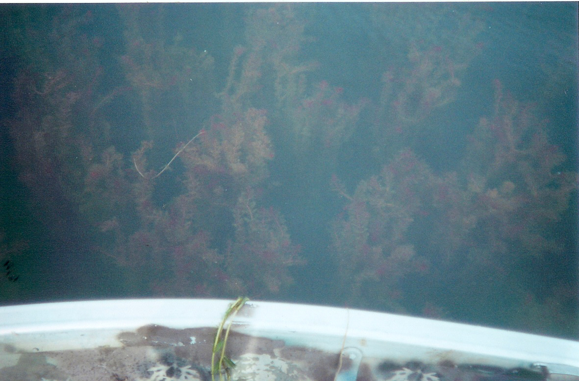 Here is some milfoil that was nearly ruined by a heavy storm that muddied the lake up bad in the area.This milfoil patch is usually my best jig fishing area, but it anit looking good.Notice the red tassel tops.That is when milfoil is producing alot of oxygen,dispite its unhealthy appearance. There should be fish here.P N J