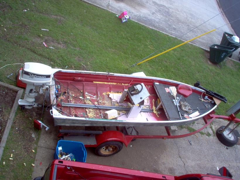This is the last pic taken of the progress. I went with a low deck in the middle to brace the gunwhales. Console is starting to take shape. Eased the porpoising problem some with more weight in the front, but its still there and Im going to change the trim settings some to try and help it. My main concern is still the structural integrity of the boat. Its gonna get the **** beat out of it with waves on some big lakes so it needs to be like a peice of iron.