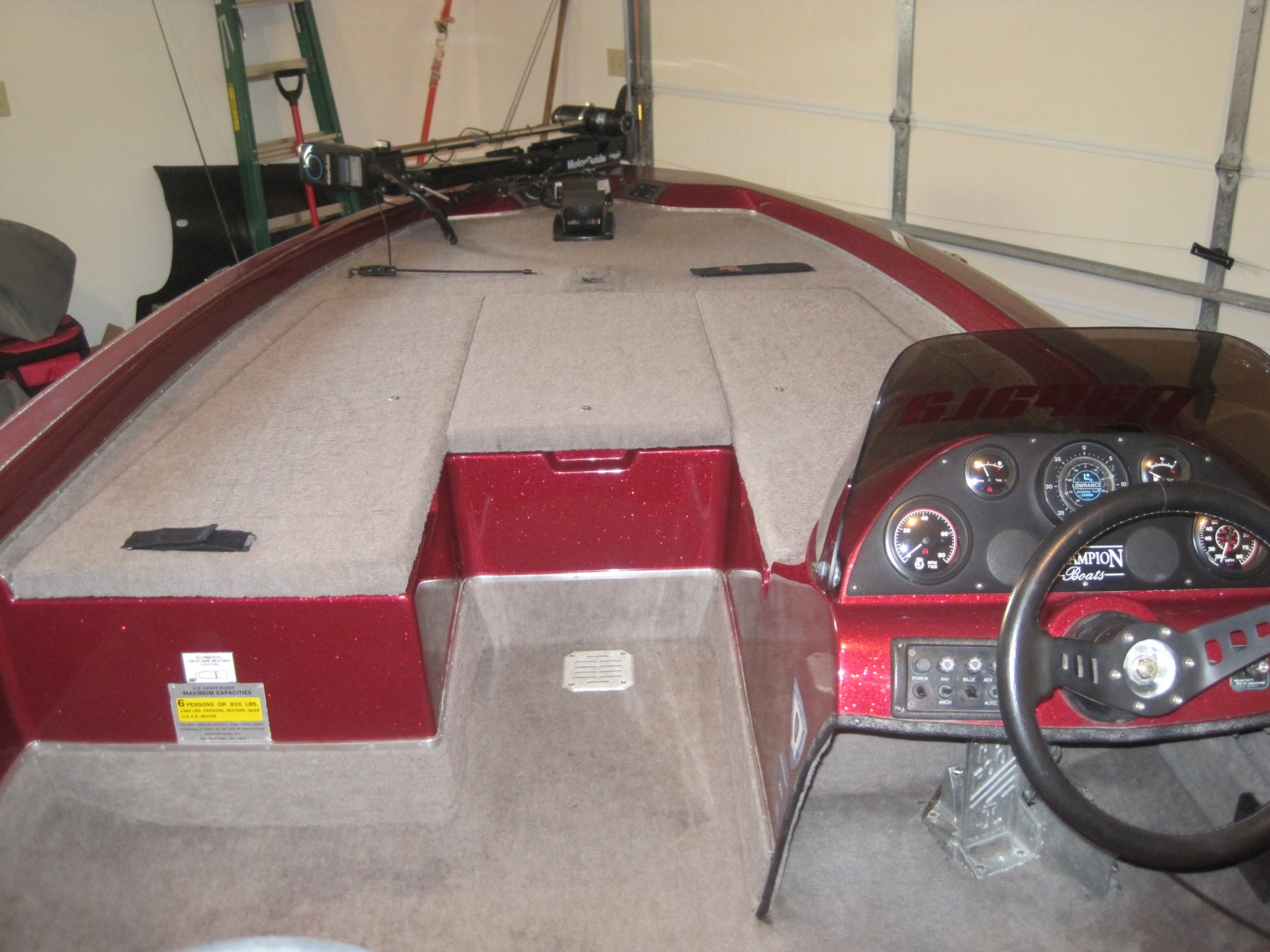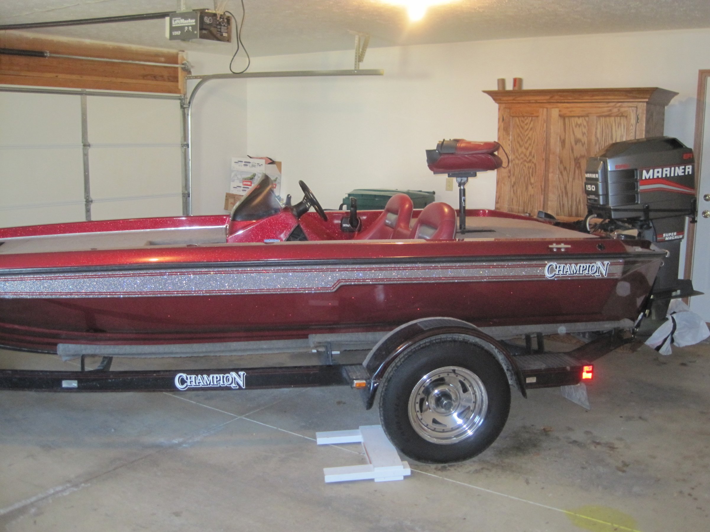 Finally pulled the trigger on my 'new' boat this weekend. Keeping it in my garage for right now until I can get a spot at our local boat storage. 1995 Champion 186 w/ 150 HP Mariner EFI. 50 lb. 12/24 volt Motorguide Brute trolling motor which will probably be upgraded soon.