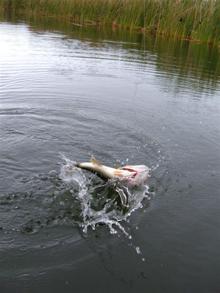 Went out saturday in 15-20 knot winds with my son Ben. The little trolling motor could hardly keep the boat moving forward, but the bass were hungry. Got about 30 on all types of artificials; swim baits, crank baits, jerk baits, rattle-traps, buzz baits, and a couple on spinnerbaits. We had fun trying to get pics of them jumping. Here are a few: