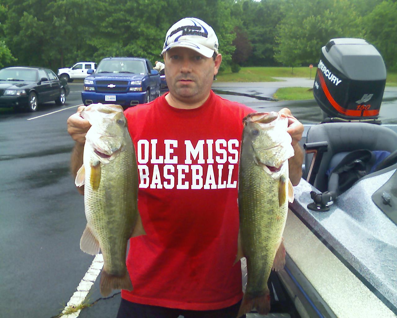 Today would have been the same but the wind and rain made things a little tougher. Winds at 20+mph make it difficult to fish main river grassbeds especially on the VA side. Took 19+ to win LAPR with 18 to make the top 5. Grass was the key...main river grass beds early. We caught ours on plastics (creatures and tubes) on the main river and then on lizards in the creeks. Finished with 17.87lbs. Here's a photo of our two best fish today. The biggest just shy of 5. Last edited by 3dkicker; 06-03-07 at 07:20 PM. |