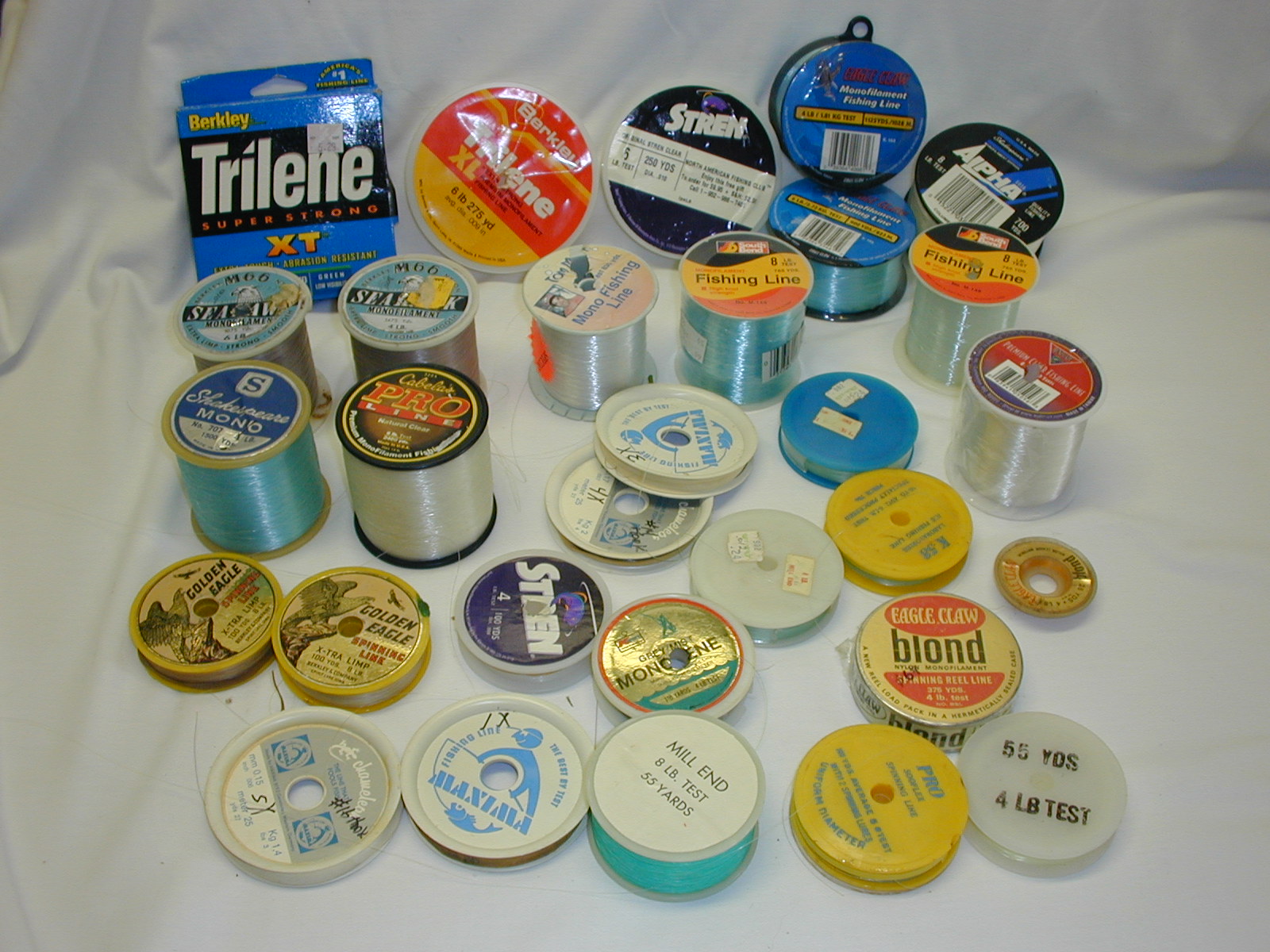 The last pic shows some lighter line: There are 30 spools of lightweight line here, some used, some new and never opened. I didn't examine each spool individually but it appears that nearly every spool is unused or more than half full of line. Some of this is vintage line that has never been opened (the Eagle Claw Blond). It is all between 3-8 pound test. Some of the names: Maxima, Tom Mann, South Bend, Cabela's, Shakespeare, Berkley Sea Hawk, Stren, Berkley, Golden Eagle, and others. I can sell it a few spools at a time, or by the lot, whatever you want. If you want the lot of heavy line, I'm thinking maybe $48 shipped. Heck it will cost me at least $9 or $10 dollars just for shipping. Anyone interested in the light line, how about $60 shipped? If these prices are too high, make me an offer. There's a ton of line here, so let me know how you would like to buy it. Thanks for reading my post ... and FISH ON!! |