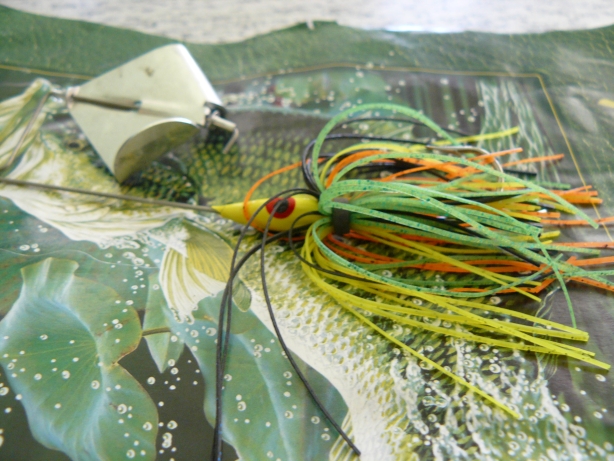 top picture is a brim colored bait using it around the spawn is killer. -fished over beds- i use 2 colors of buzzbaits white and white/chartruses. always add a trailer hook. want a mod them using a small drill bit punch a couple holes half way between the shaft and the bend in the wing..
