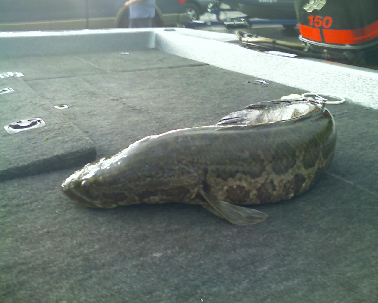 ) came up for a little club tournament on the "radioactive mudhole" and was wandering around the parking lot looking for discarded baits because, and I quote, "I can't catch a friggin' thing out there. What the he*# do these mutant bass eat?" So he hops into the boat and I take him up lake and put him on numbers of quality bass. Of course I'm crushing bass on some of the latest and greatest baits ever produced and he's muttering something about deadlines and pictures and job related things . Of course when your mind is on work and you're not connecting with nature you miss the subtle strikes by those wiley Lake Anna pigs. He does finally connect with a 8" monster of a bass and he then settles down only to throw c-rig the rest of the night and come up empty. He's got pictures and he may post them for everyone once he heads home on Sunday or Monday ![]() .So today I head out on the river for a little bassin' fun. I'm fishing with a new club member and we run into a small feeder creek that holds a few nice post-spawn keepers in a small pad field every year. We catch a couple fish out of the pads with one keeper in the boat. We work our way back to some laydowns, I bang one possible keeper off the front seat, it hits the deck, takes one bounce and away it swims never to get the courtesy measure it deserved. Rob sets the hook on a good fish and claims he's got a catfish due how the fish is digging into the mud bottom and not coming up to shake it's head. I get the net and wait until this 8lb 2oz snakehead comes up to say hello. Not what either of us was expecting. Since these fish are an invasive species it goes into the livewell to be eaten at a later date. Last edited by 3dkicker; 05-31-08 at 08:51 PM. |