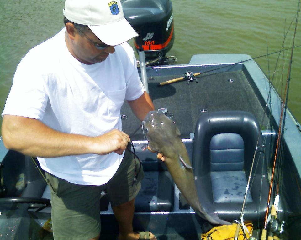 . I had left it in the truck. Ya think that mistake may come back and kick me in the arse???? So he hits another short on a tube craw and I watch one spit out a swim bait. Not the best stuff so we run to a set of laydowns that have produced in the past. We put 6 of the next 7 fish in the livewell off of 4 trees. The one below gave up my best fish for the day. All 6 fish punish a craw imitation. So now we have 7 in the well and we're on our way. Run to another set of laydowns and we're running out of water . It's only 9:30 and low tide is at noon. The laydown farthest away from the bank gives up 4 fish and the only one that would have measured shakes me off at the boat.........hmmm . Off to the marsh bank and we catch one apiece and now we have one limit in the boat and my 4 fish. It's getting really skinny and winds blowing good now but we stop at a good post-spawn spot. Partner culls two of his 5 with a 3 and a 3+ while I'm being pestered by a pesky used gutter salesman from Asheboro, NC. Partner's limit is looking good and I'm still one short. We start looking for deep wood any where in this creek. I hit a couple shorts and frustration starts to creep in the same way the bait monkey starts to give you that itch. We pull up to a nice deep laydown that has given up some nice fish in the past. I pull a baby Paca across it and BAM! it hits like a freight train but this trains got wiskers and the channel weighs in at 8lbs 2oz just like yesterdays snakehead. Where's Capt. Mike when you need him?? Finally tally for the day put us at 9 bass for just shy of 24lbs and due to t-storms rolling in we left without knowing if we pulled a last place to first upset. Great fishing on the river today.