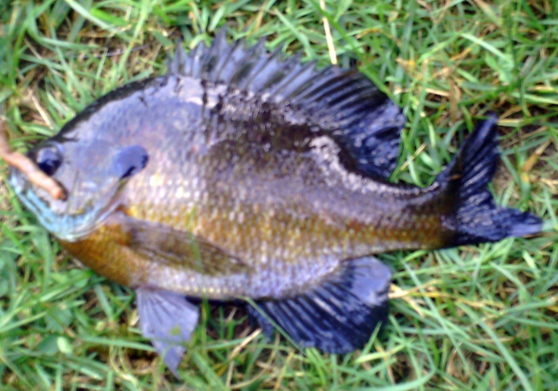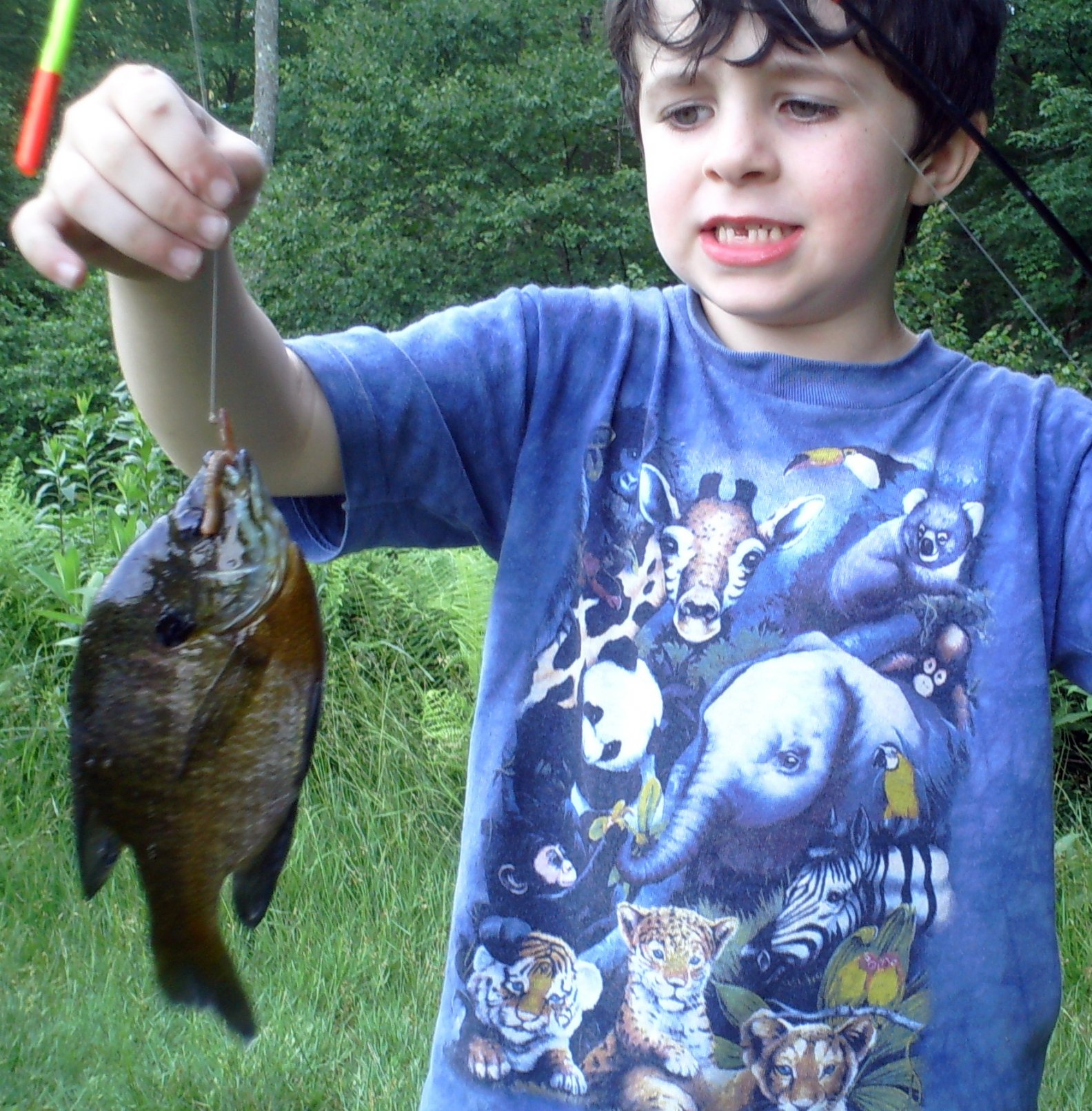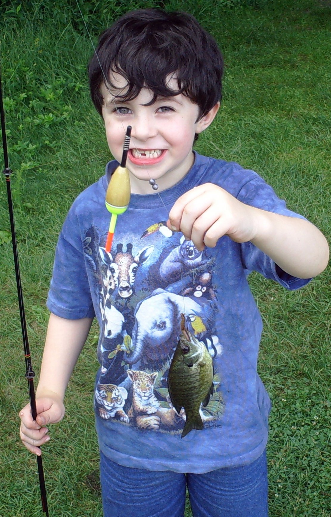 well had a fun but short trip with the kids tonight . they hooked a couple blue gills , and while i connected with a few bass i failed to land them oh well but i did have a perch nail my spinner which was a surprise to me but the kids loved seeing it . here are some pics . ... my other son was camera shy the one on the ground belonged to him .